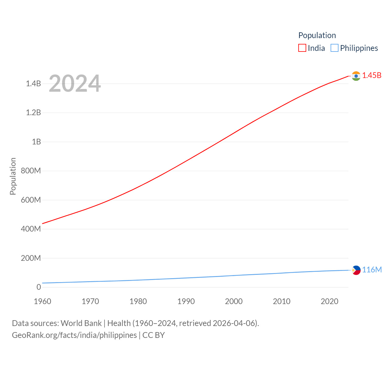 India has a population of 1.45B (ranked 1/197), compared with 116M in The Philippines (ranked 14/197). India's land area is 1,147,955 sq mi versus 115,124 sq mi for The Philippines (ranked 7th vs. 71st).