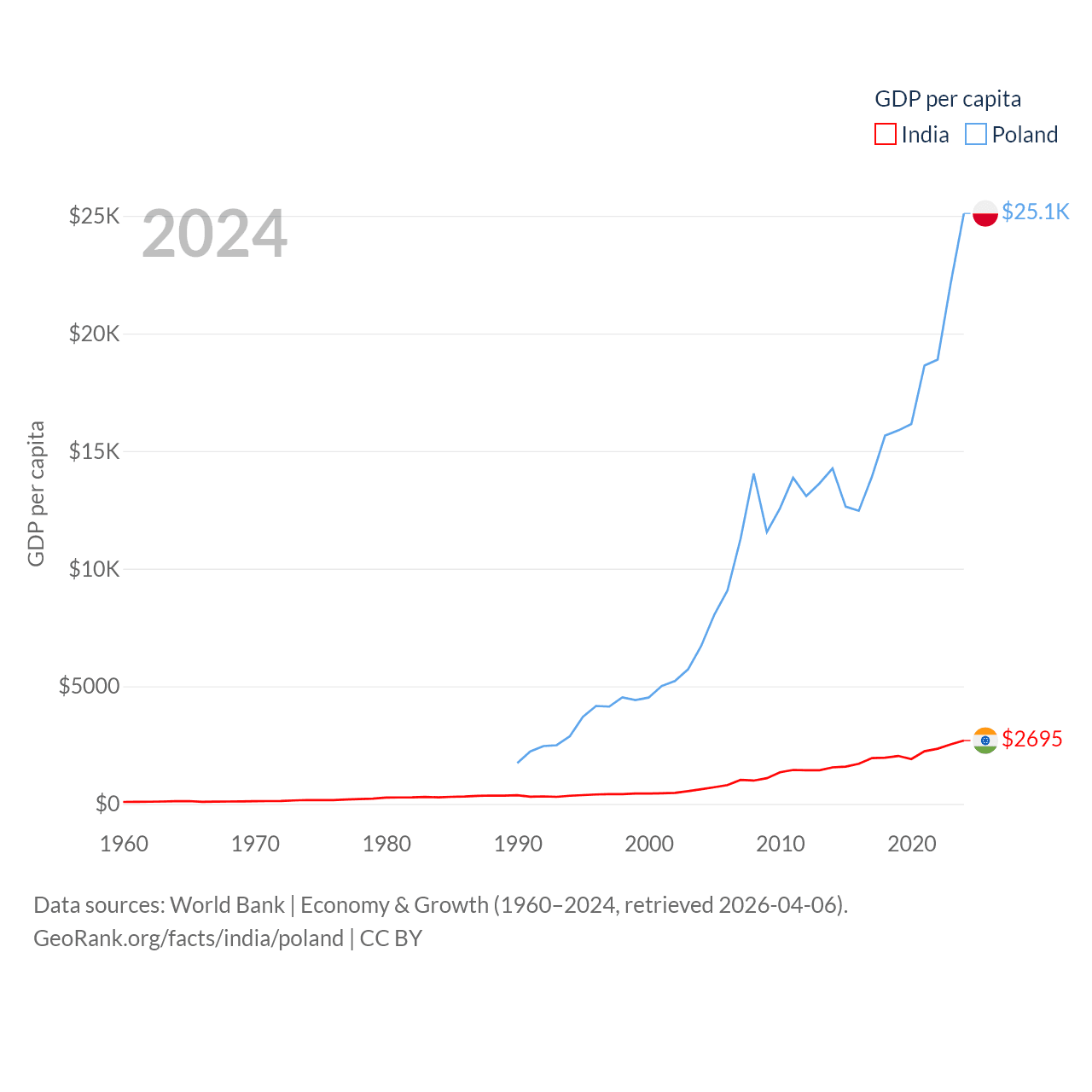 By GDP, India ranks 5/197 ($3.91T) and Poland ranks 21/197 ($918B). By GDP per capita, India ranks 143/197 ($2,695), while Poland ranks 48/197 ($25,104).