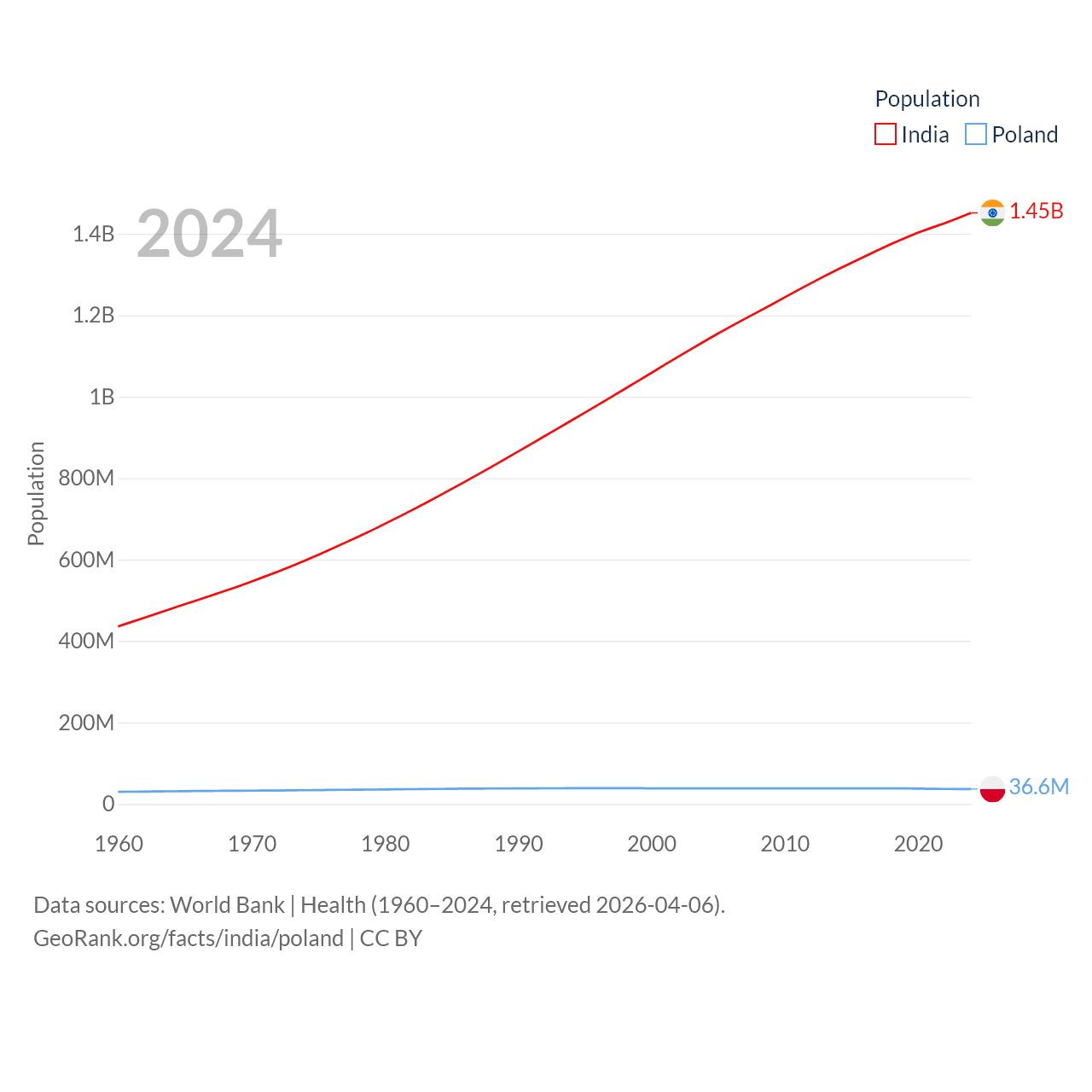 India has a population of 1.45B (ranked 1/197), compared with 36.6M in Poland (ranked 42/197). India's land area is 1,147,955 sq mi versus 118,252 sq mi for Poland (ranked 7th vs. 69th).