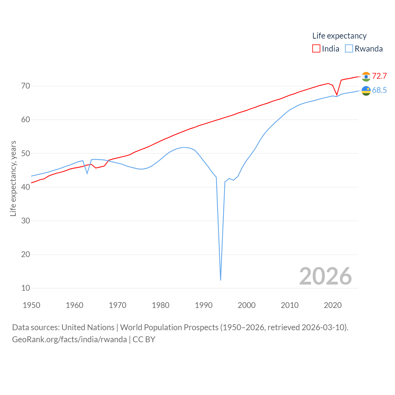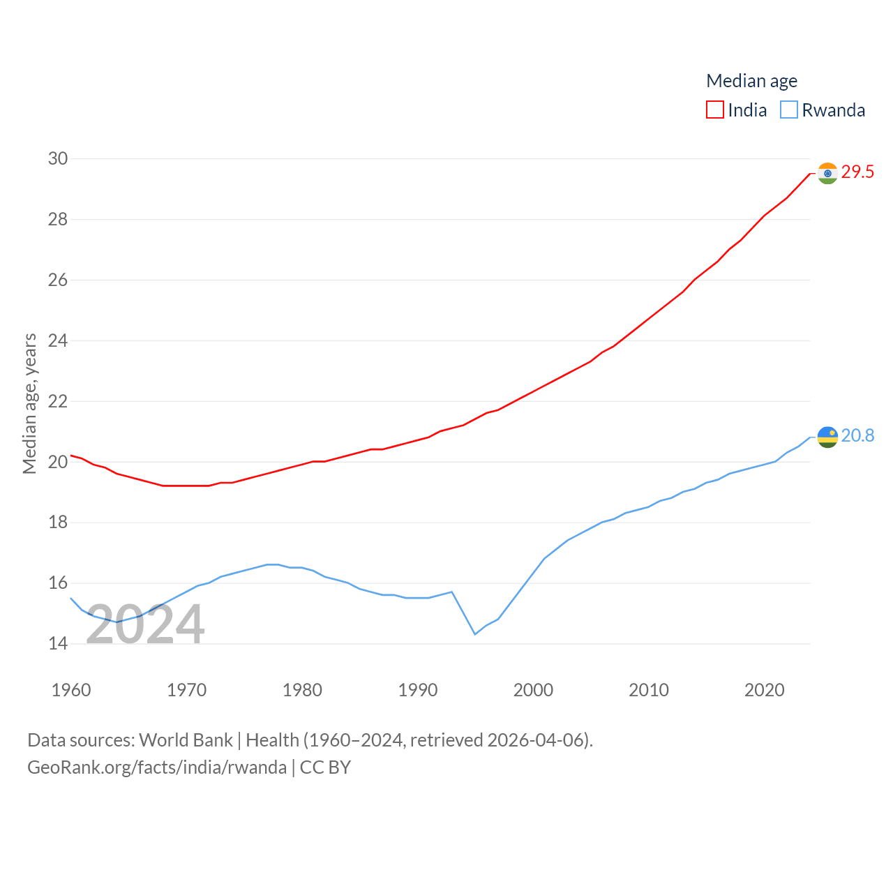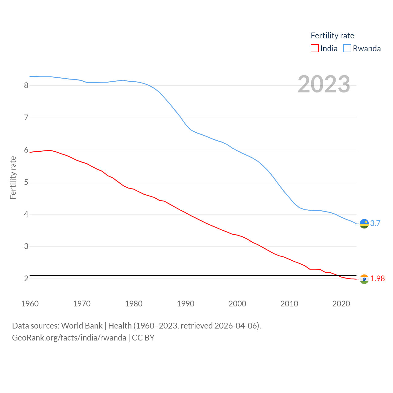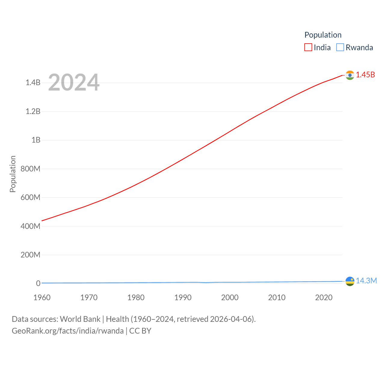 India has a population of 1.45B (ranked 1/197), compared with 14.3M in Rwanda (ranked 77/197). India's land area is 1,147,955 sq mi versus 9,525 sq mi for Rwanda (ranked 7th vs. 146th).