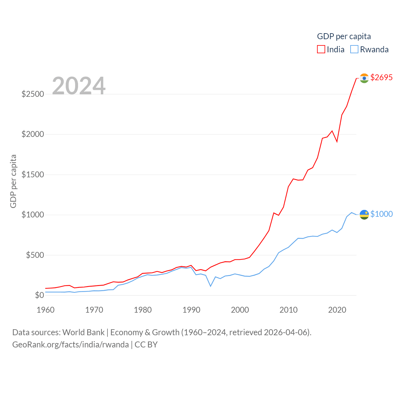 By GDP, India ranks 5/197 ($3.91T) and Rwanda ranks 144/197 ($14.3B). By GDP per capita, India ranks 143/197 ($2,695), while Rwanda ranks 178/197 ($1,000).