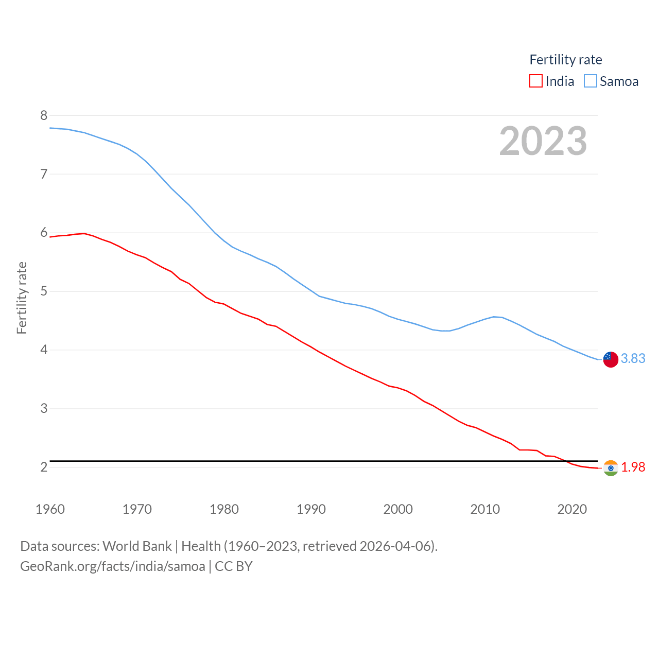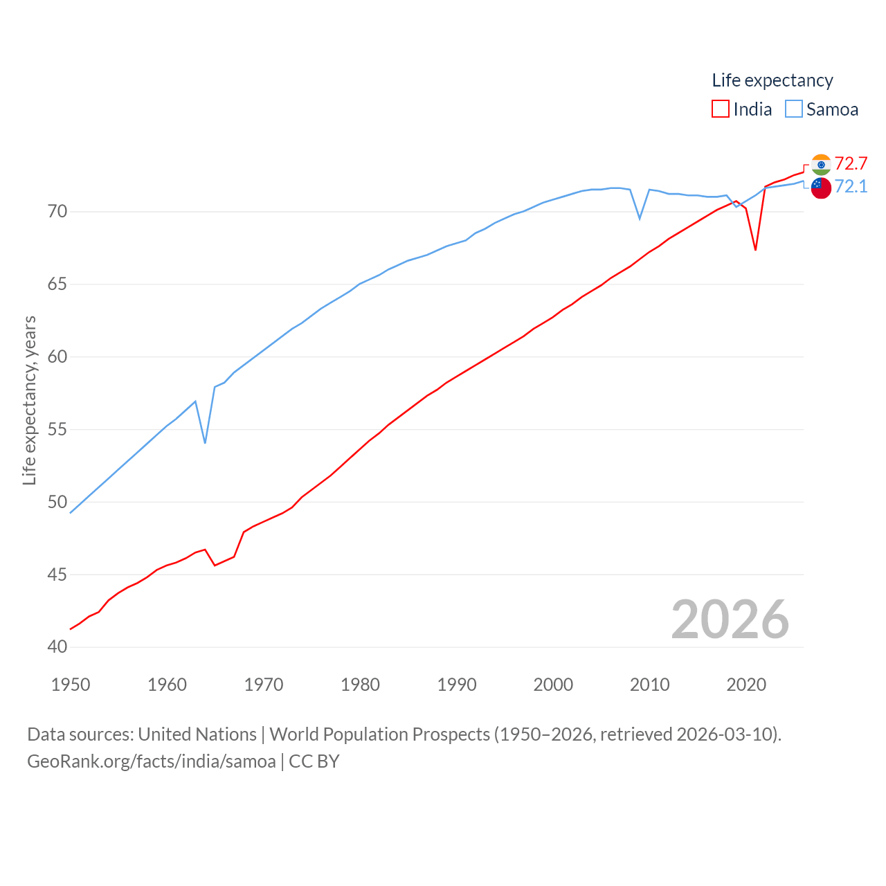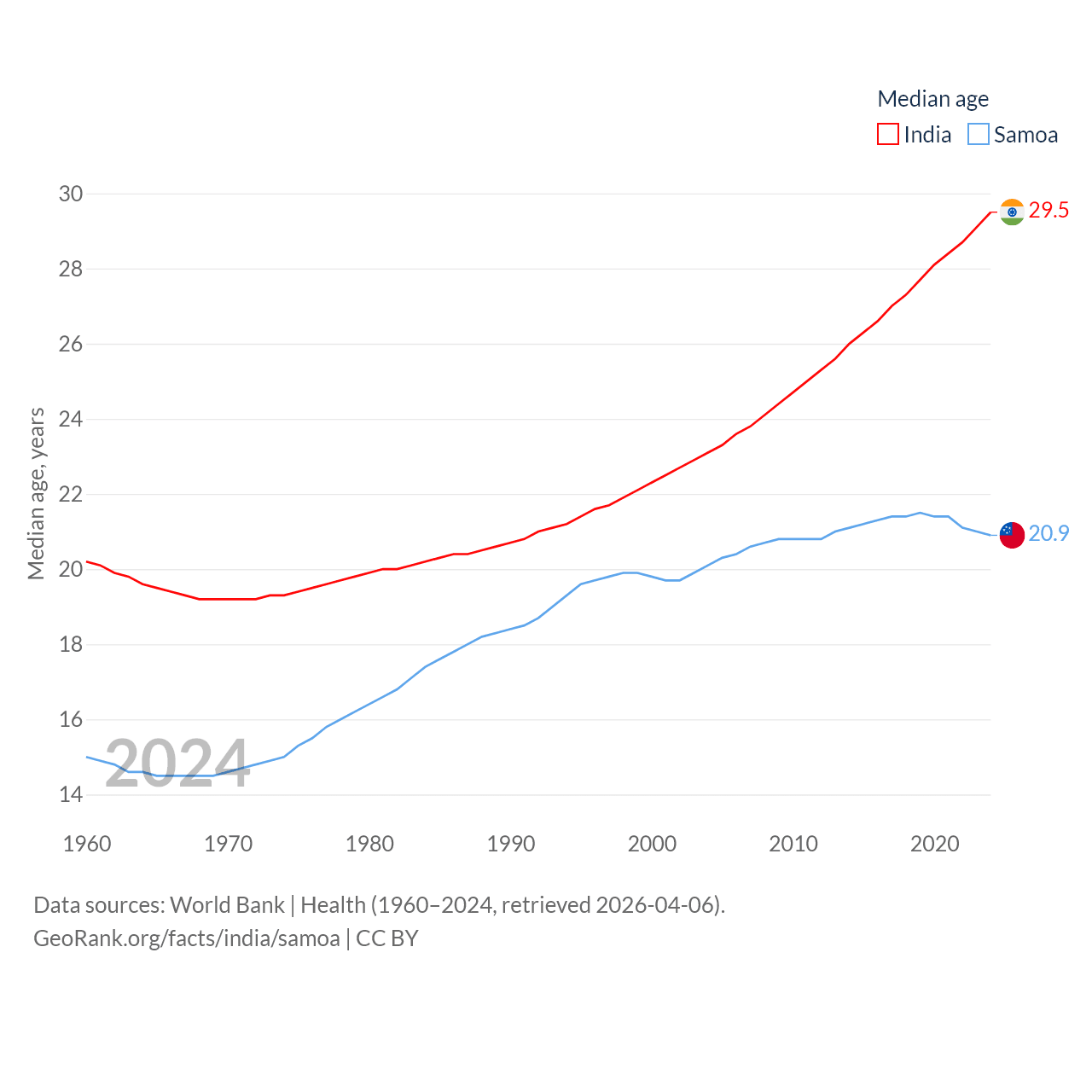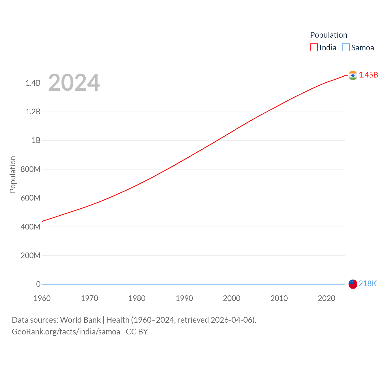 India has a population of 1.45B (ranked 1/197), compared with 218K in Samoa (ranked 177/197). India's land area is 1,147,955 sq mi versus 1,073 sq mi for Samoa (ranked 7th vs. 168th).