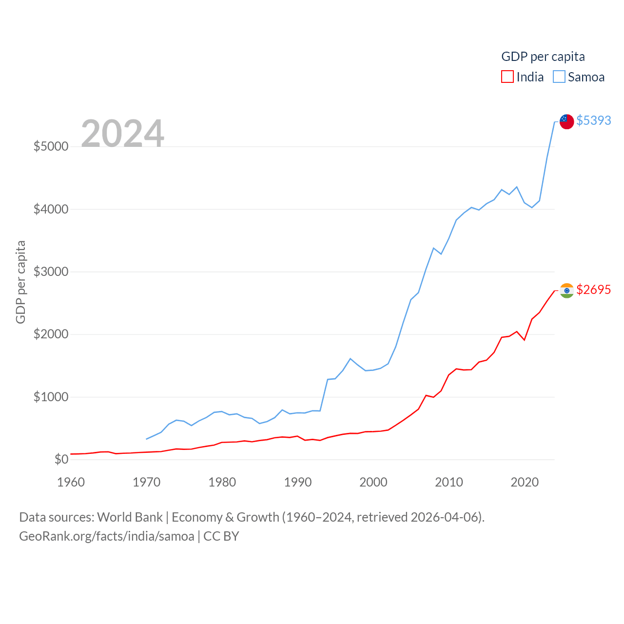 By GDP, India ranks 5/197 ($3.91T) and Samoa ranks 185/197 ($1.18B). By GDP per capita, India ranks 143/197 ($2,695), while Samoa ranks 117/197 ($5,393).
