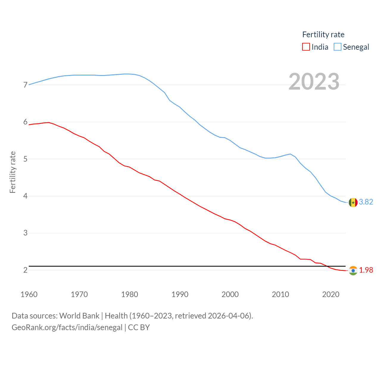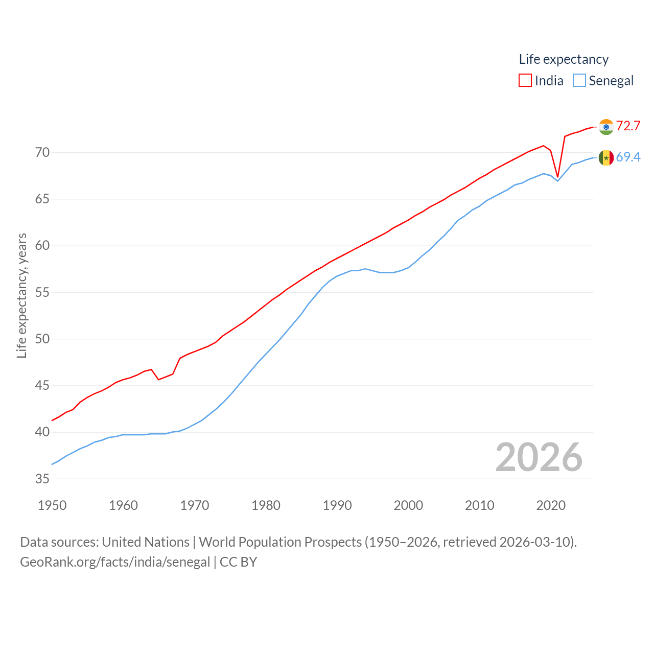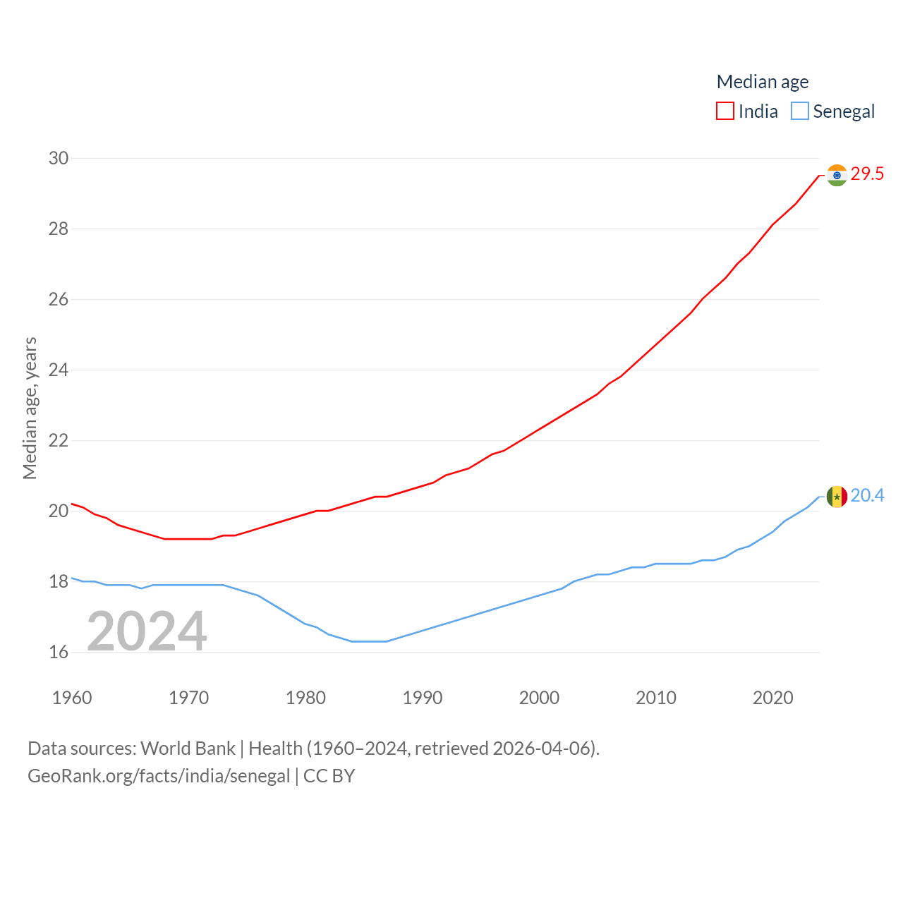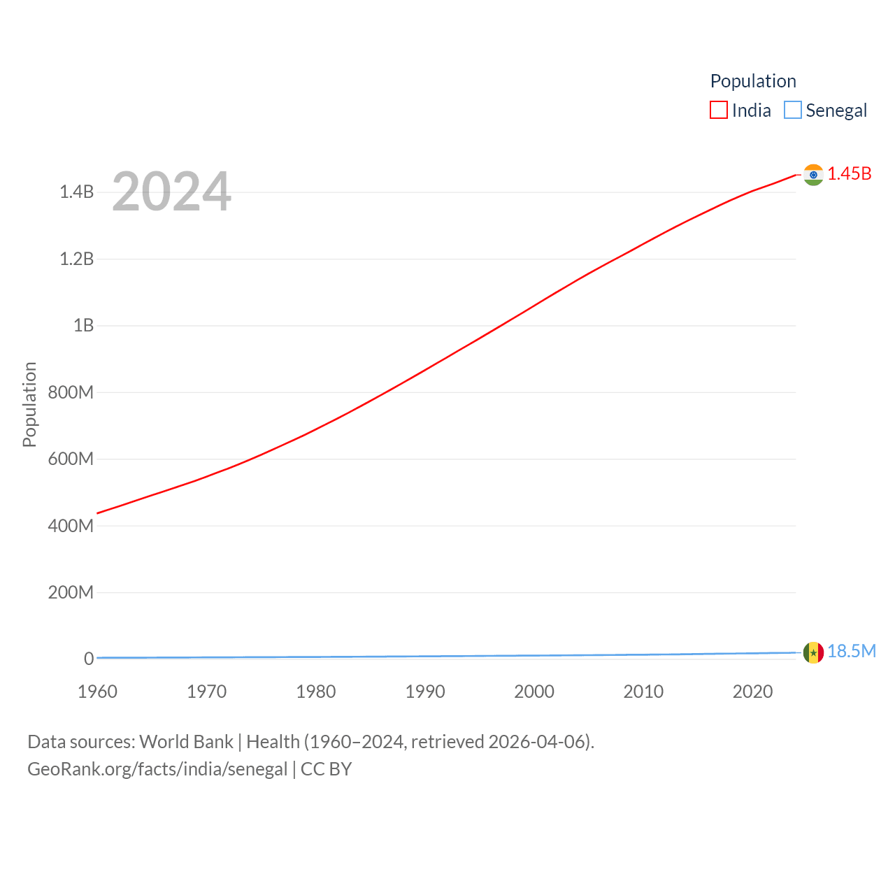 India has a population of 1.45B (ranked 1/197), compared with 18.5M in Senegal (ranked 69/197). India's land area is 1,147,955 sq mi versus 74,336 sq mi for Senegal (ranked 7th vs. 85th).