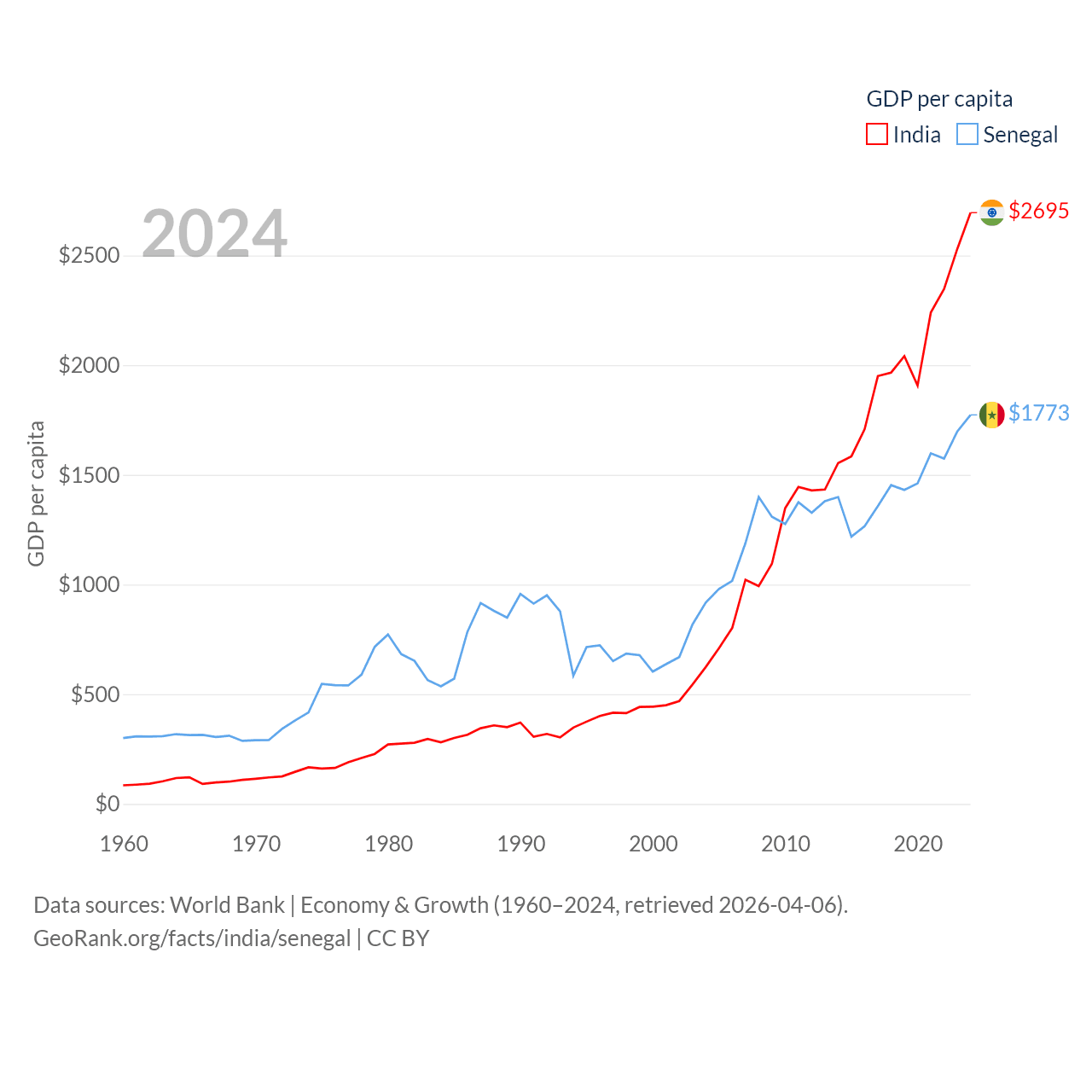 By GDP, India ranks 5/197 ($3.91T) and Senegal ranks 109/197 ($32.8B). By GDP per capita, India ranks 143/197 ($2,695), while Senegal ranks 159/197 ($1,773).