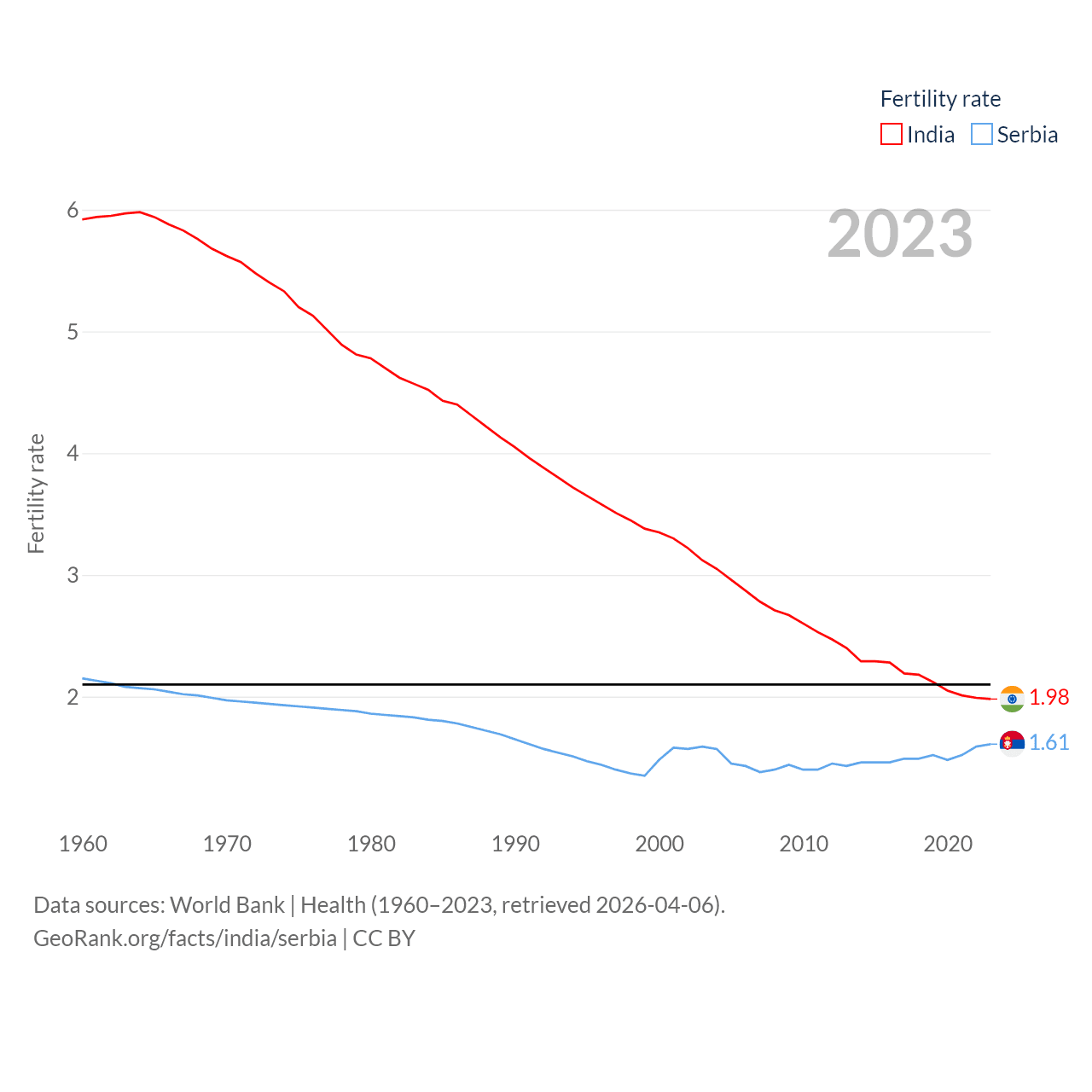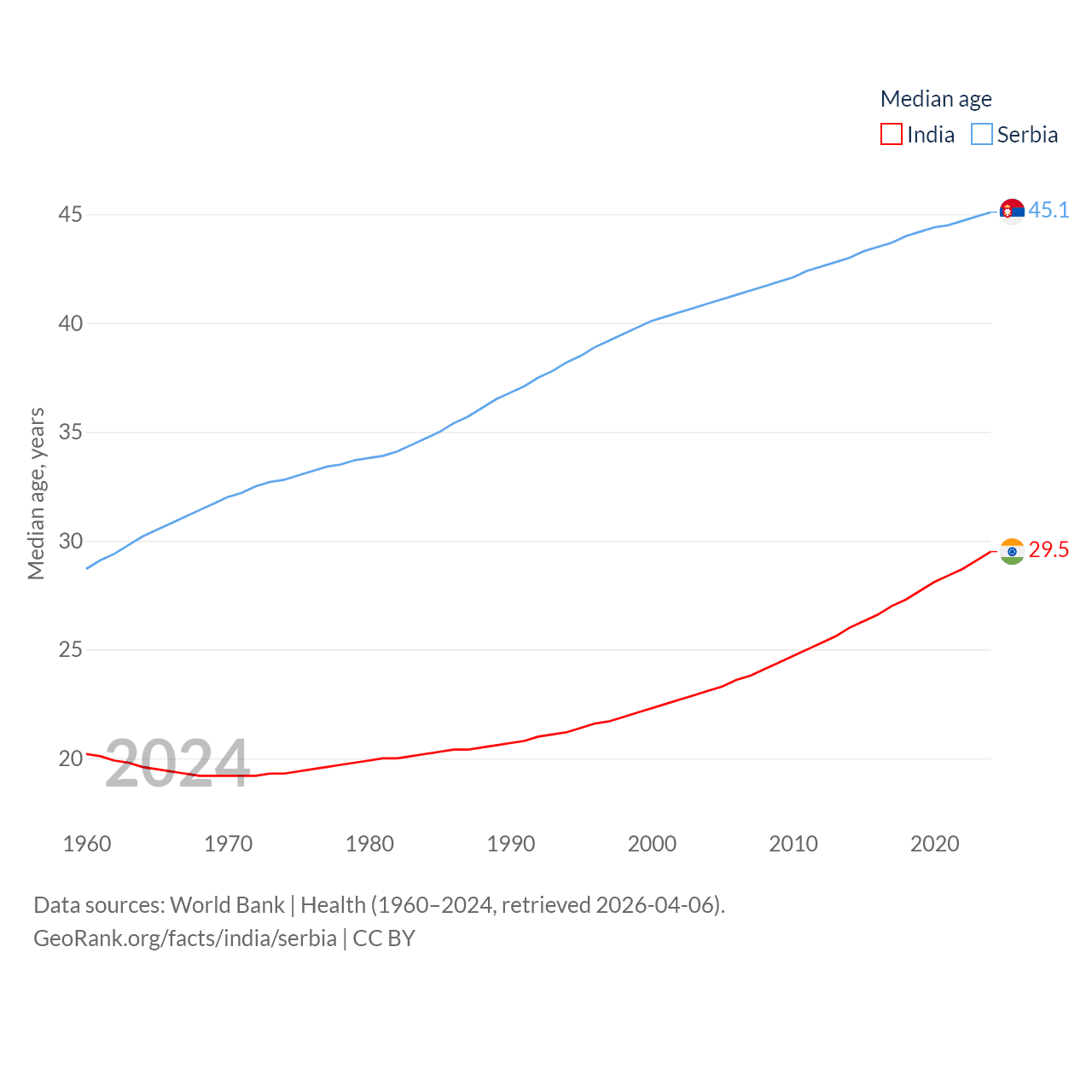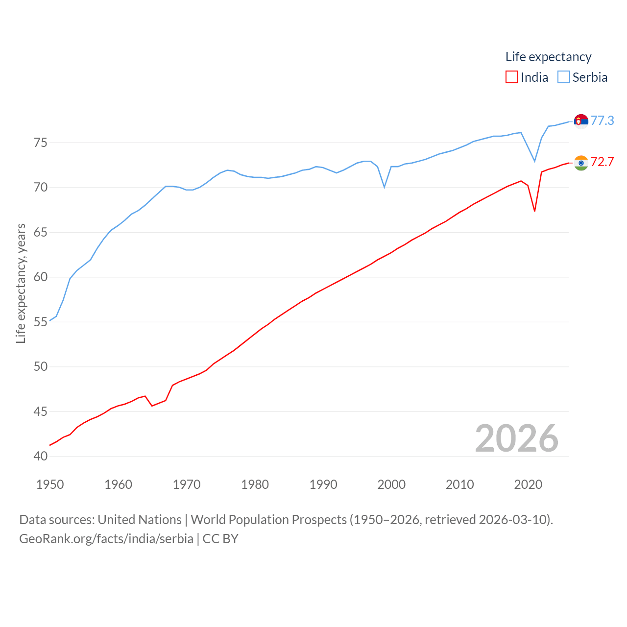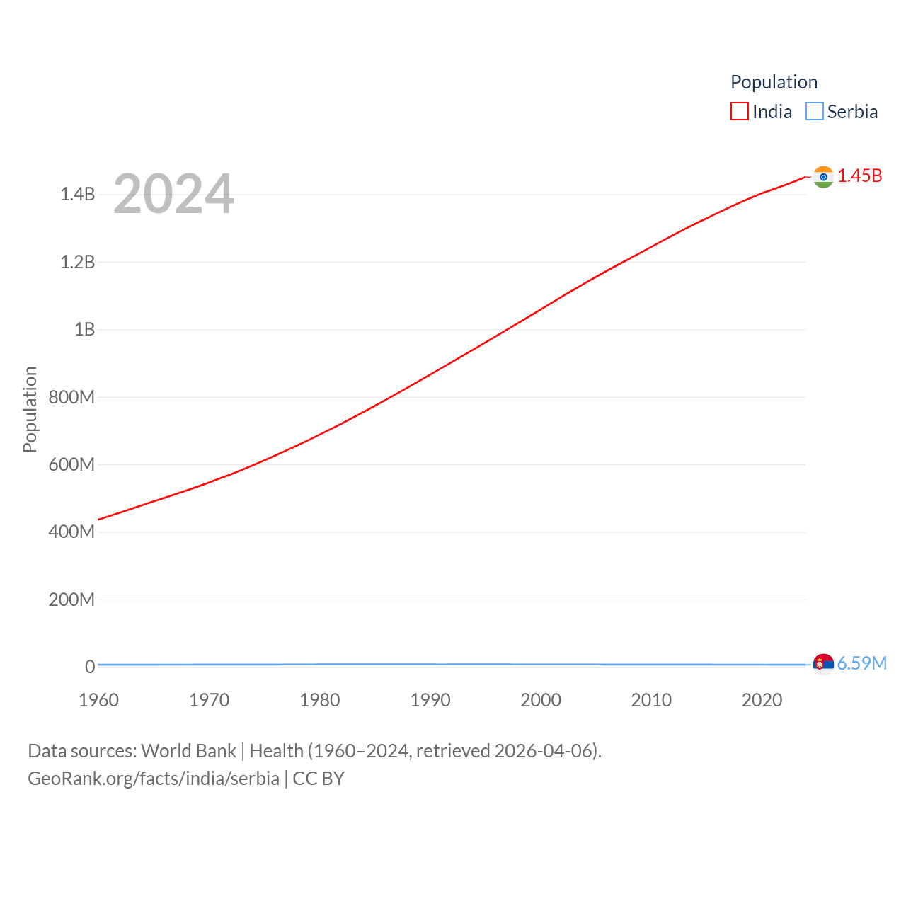 India has a population of 1.45B (ranked 1/197), compared with 6.59M in Serbia (ranked 109/197). India's land area is 1,147,955 sq mi versus 32,467 sq mi for Serbia (ranked 7th vs. 111th).