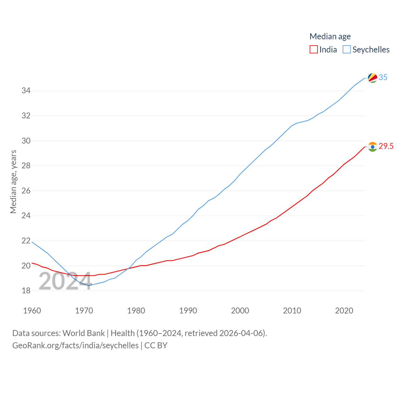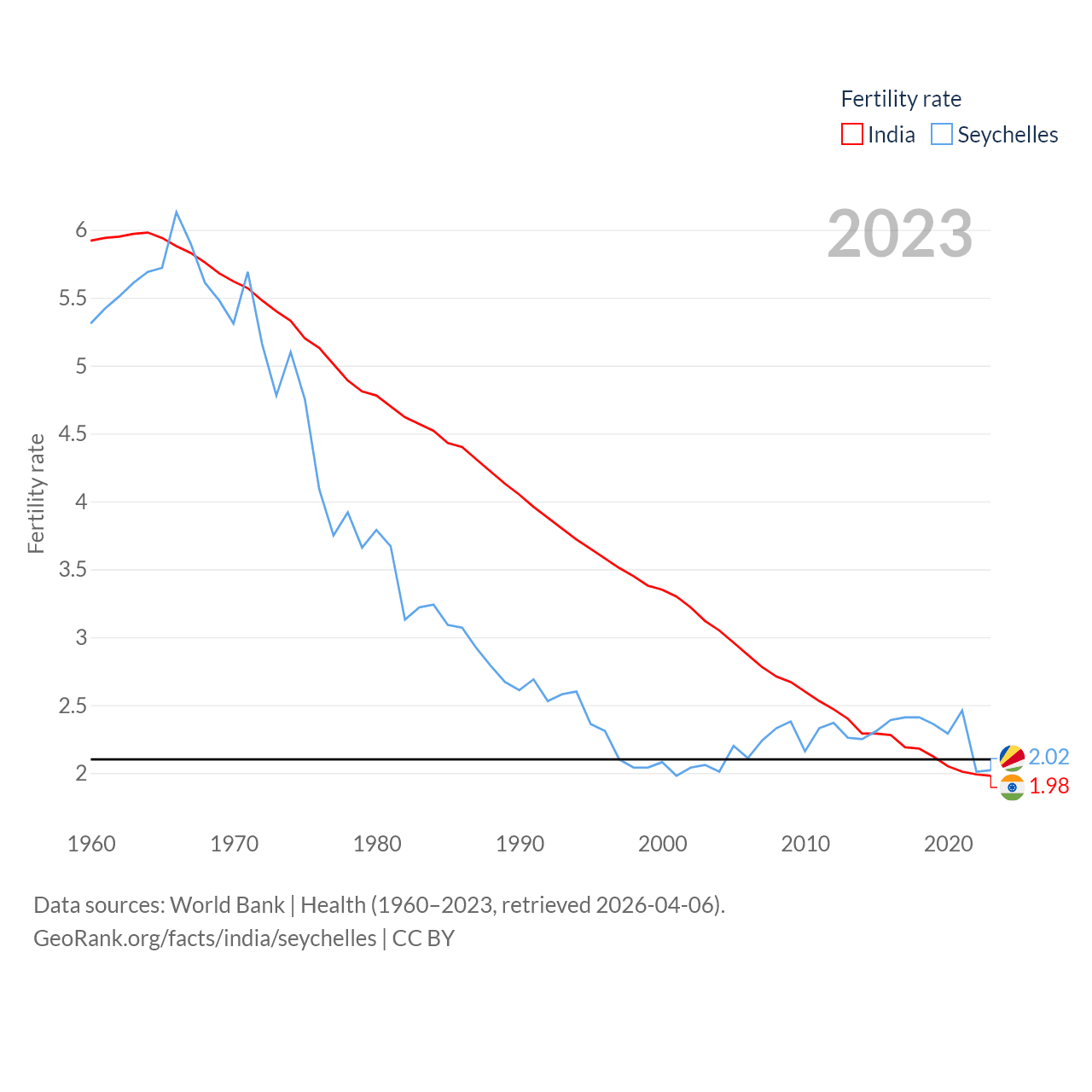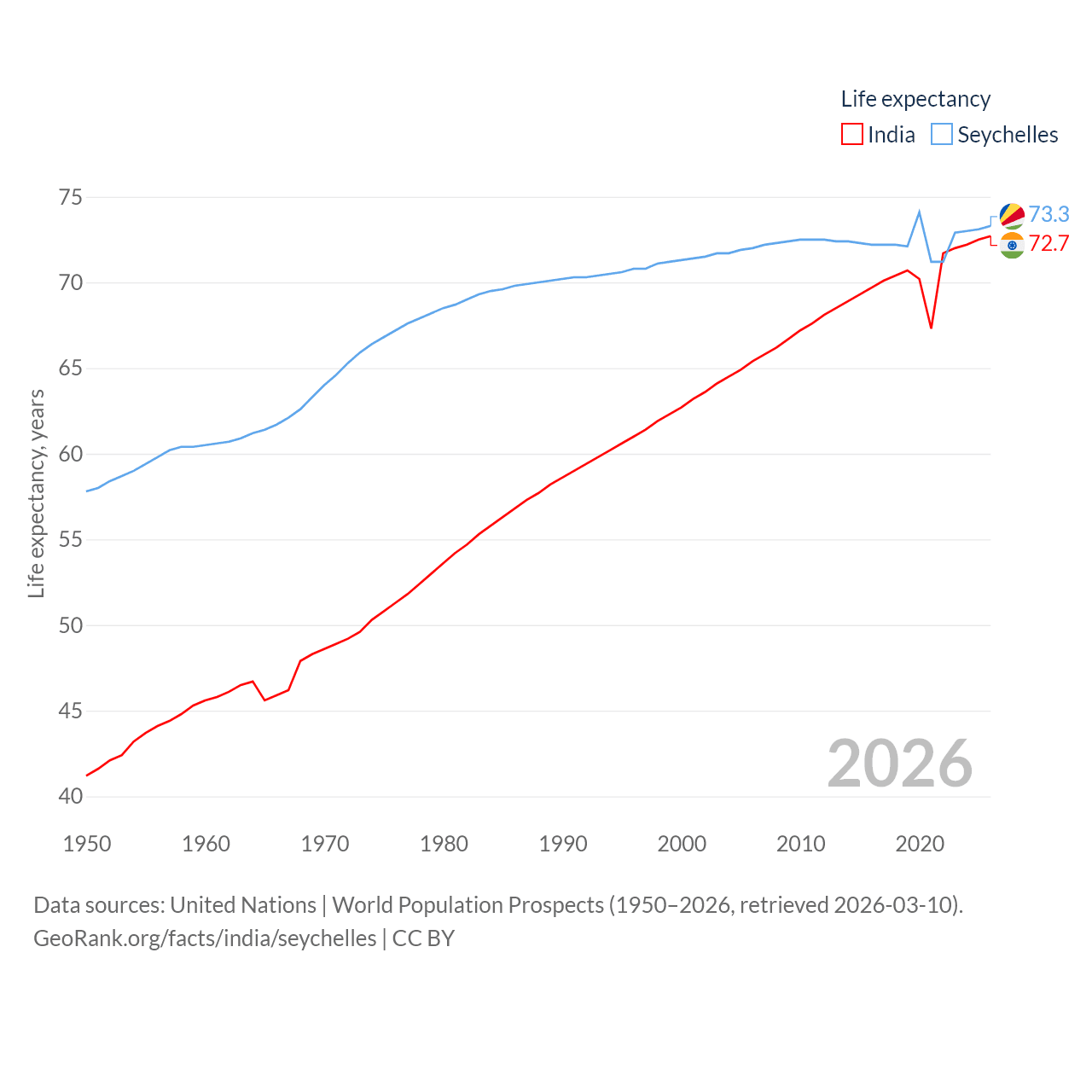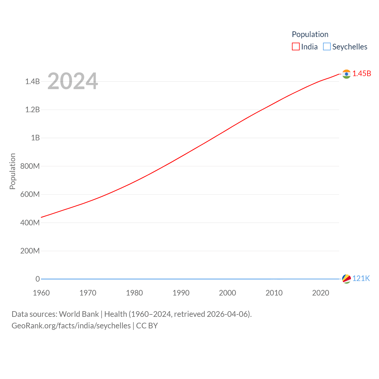 India has a population of 1.45B (ranked 1/197), compared with 121K in The Seychelles (ranked 181/197). India's land area is 1,147,955 sq mi versus 177.6 sq mi for The Seychelles (ranked 7th vs. 181st).