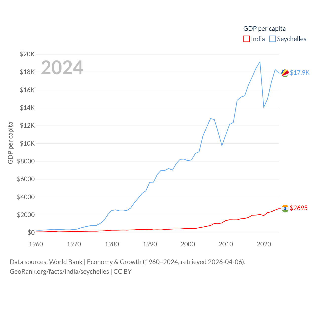 By GDP, India ranks 5/197 ($3.91T) and The Seychelles ranks 178/197 ($2.17B). By GDP per capita, India ranks 143/197 ($2,695), while The Seychelles ranks 63/197 ($17,859).