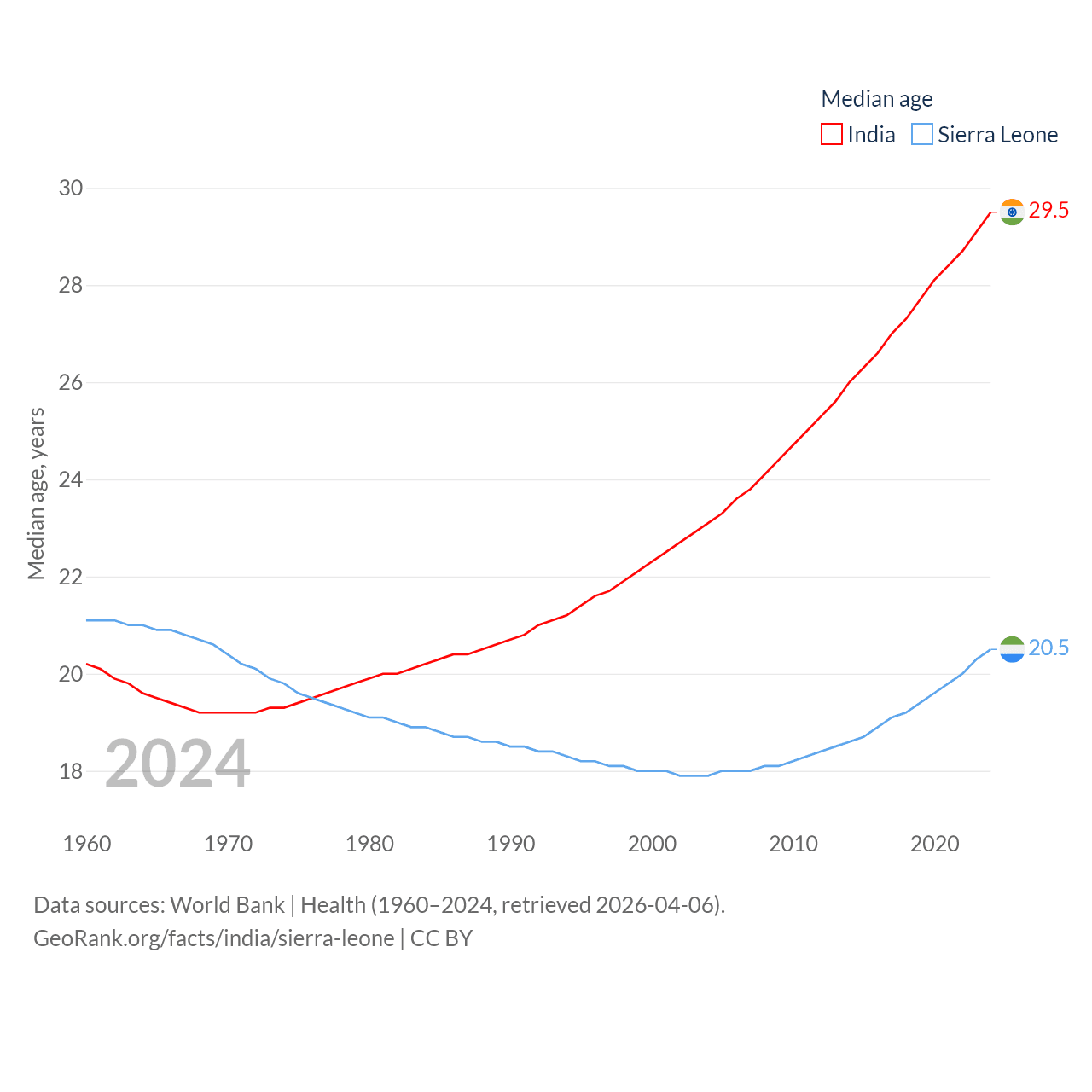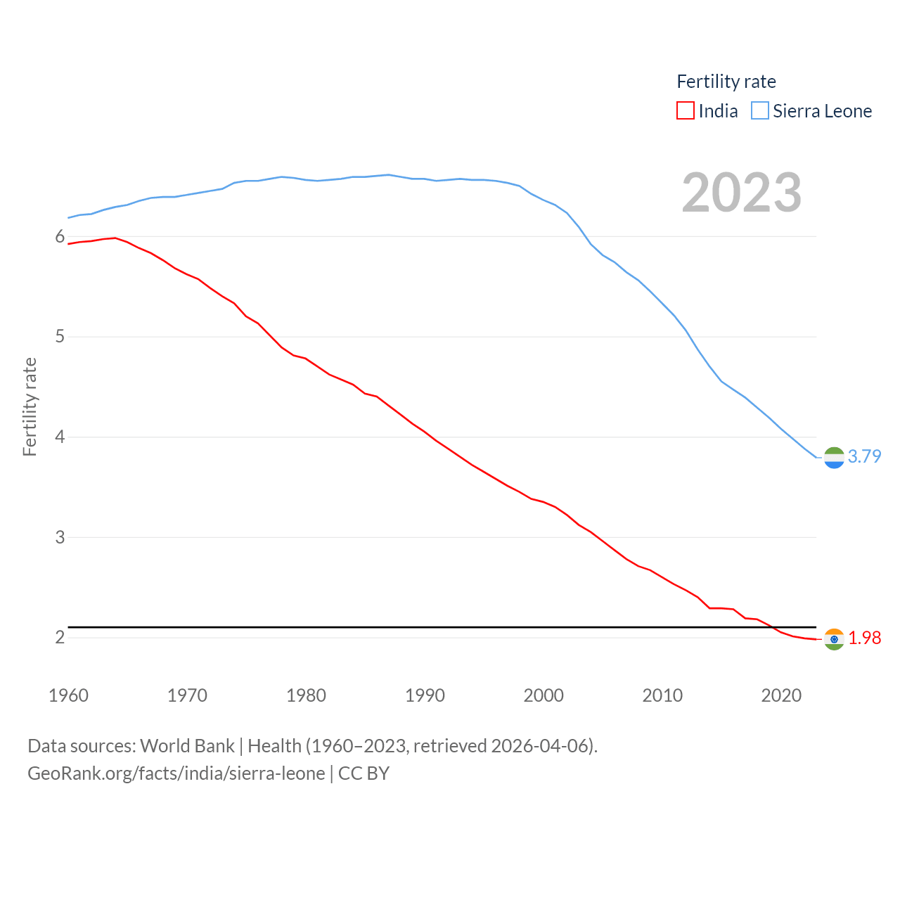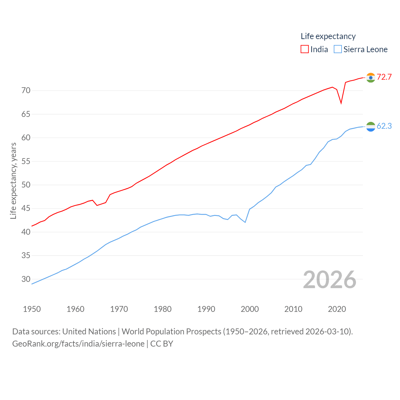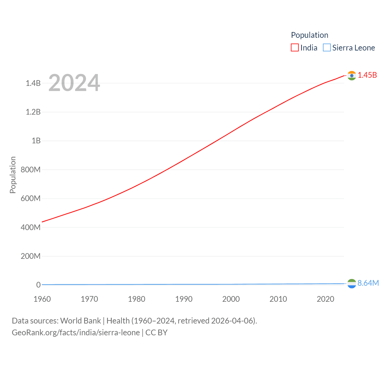 India has a population of 1.45B (ranked 1/197), compared with 8.64M in Sierra Leone (ranked 102/197). India's land area is 1,147,955 sq mi versus 27,869 sq mi for Sierra Leone (ranked 7th vs. 116th).