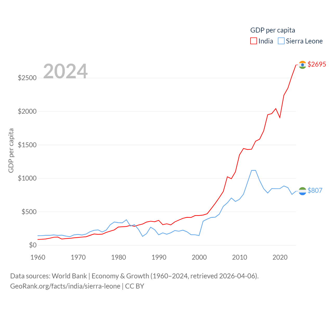 By GDP, India ranks 5/197 ($3.91T) and Sierra Leone ranks 160/197 ($6.97B). By GDP per capita, India ranks 143/197 ($2,695), while Sierra Leone ranks 186/197 ($807).