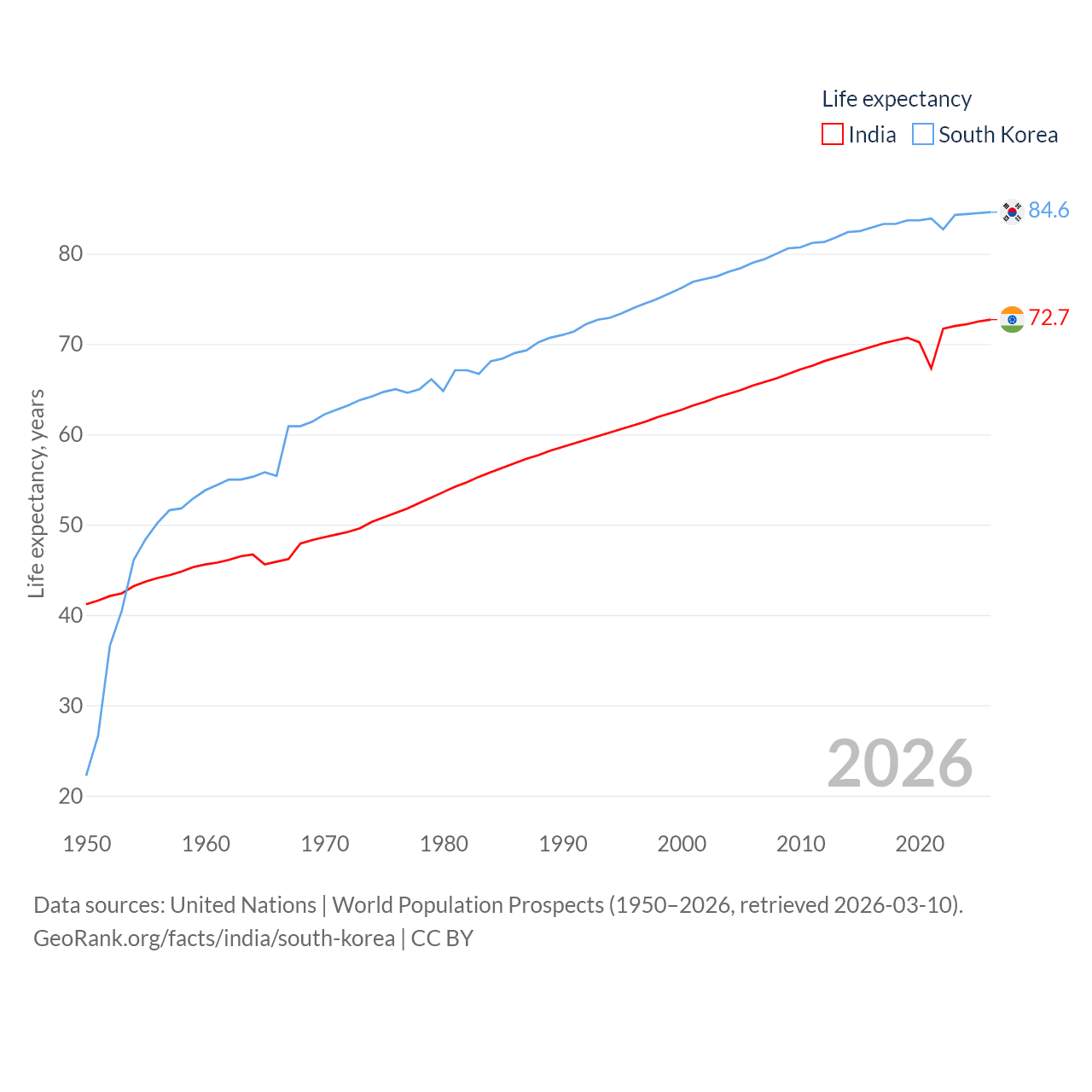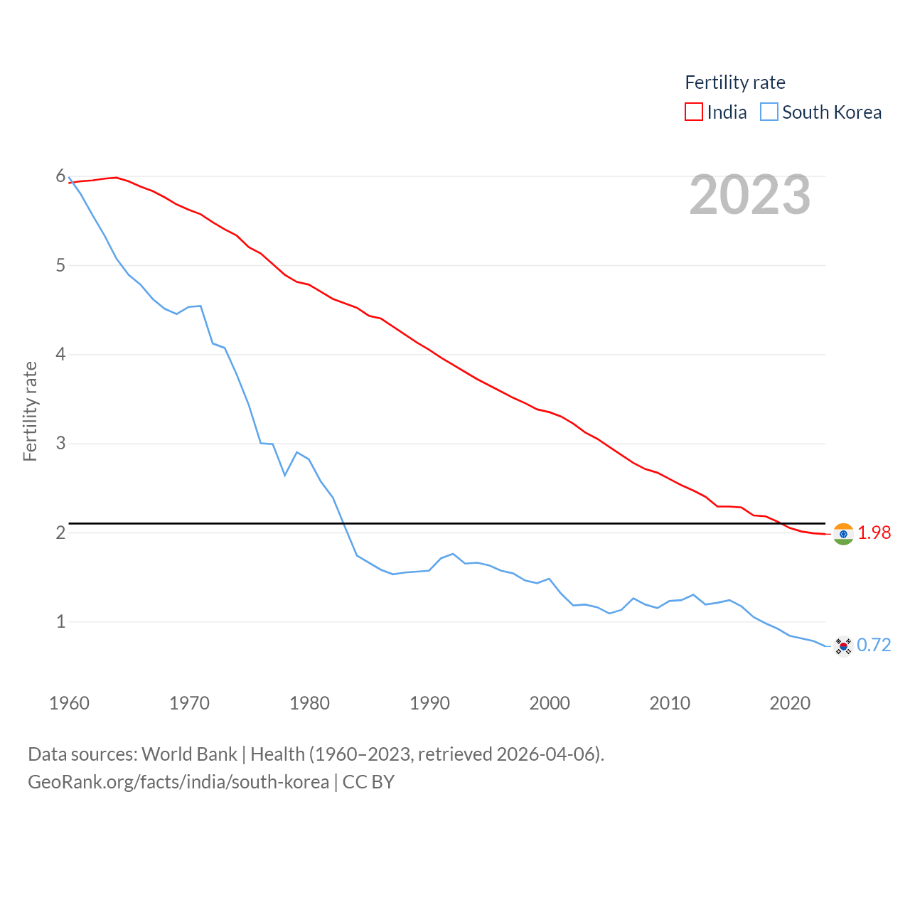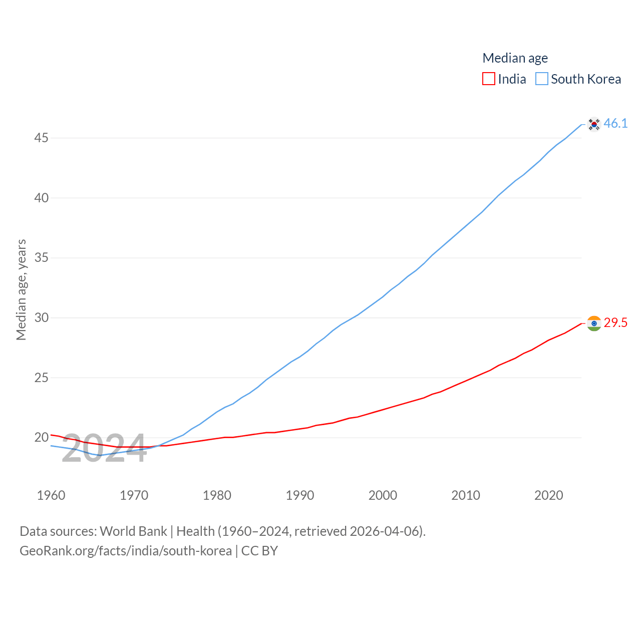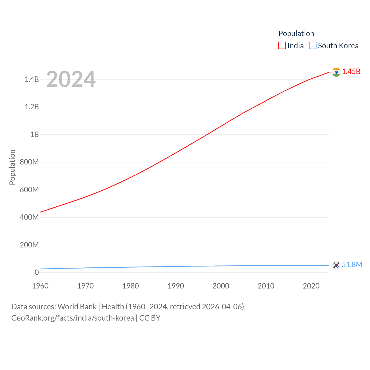 India has a population of 1.45B (ranked 1/197), compared with 51.8M in South Korea (ranked 29/197). India's land area is 1,147,955 sq mi versus 37,684 sq mi for South Korea (ranked 7th vs. 105th).
