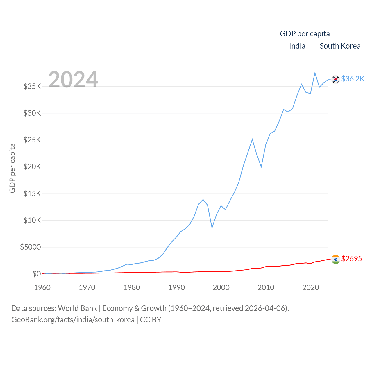By GDP, India ranks 5/197 ($3.91T) and South Korea ranks 12/197 ($1.88T). By GDP per capita, India ranks 143/197 ($2,695), while South Korea ranks 31/197 ($36,239).