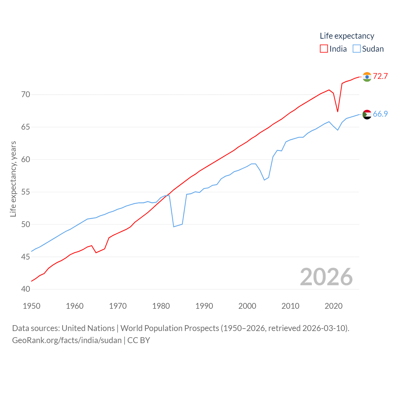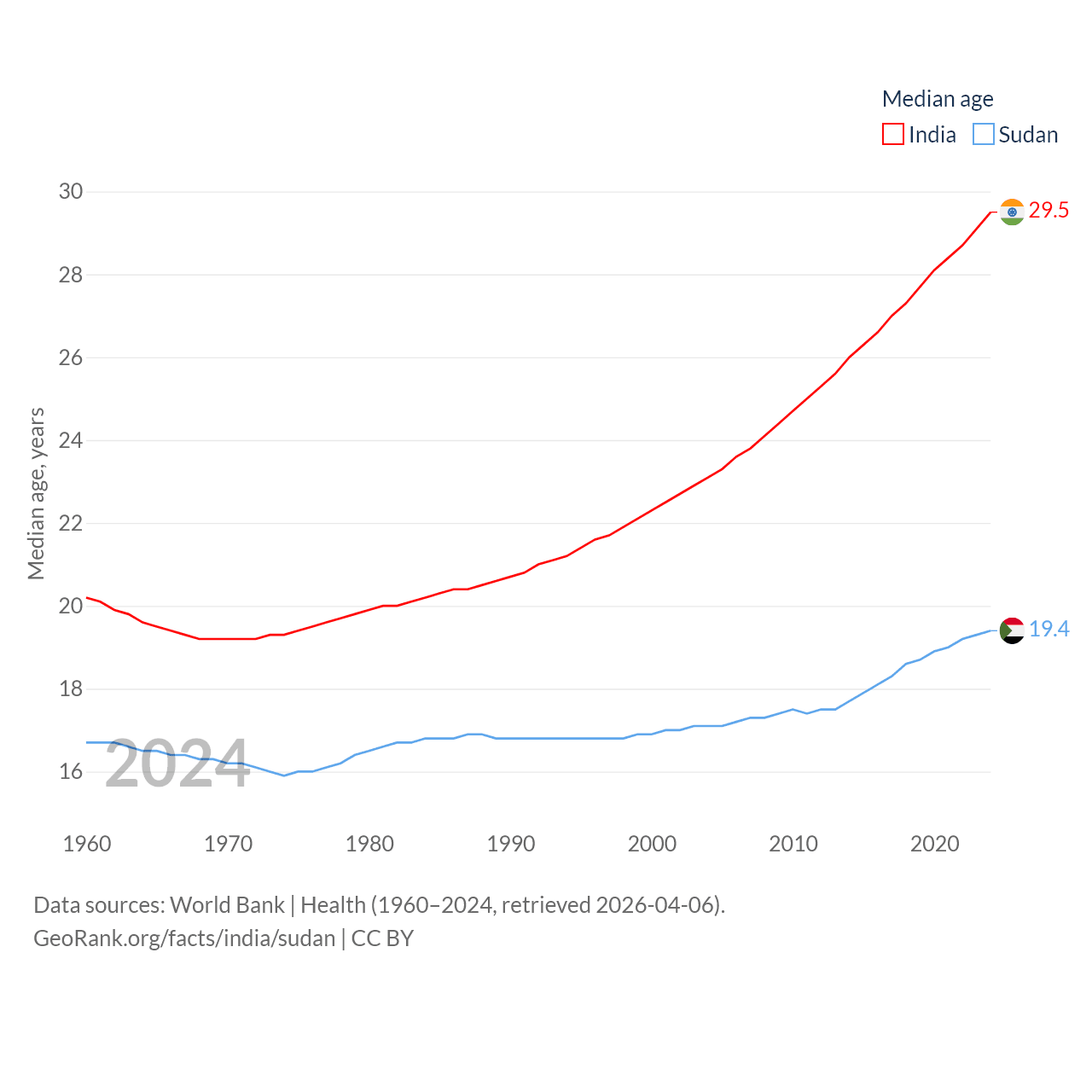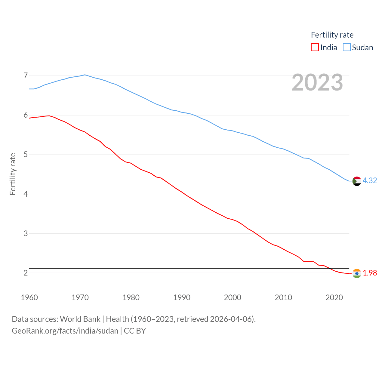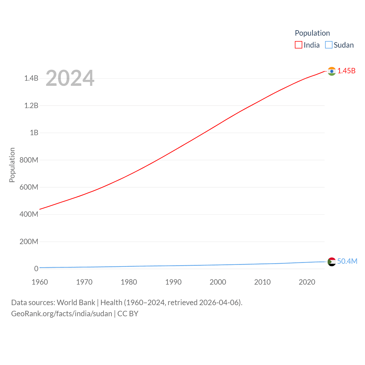 India has a population of 1.45B (ranked 1/197), compared with 50.4M in Sudan (ranked 30/197). India's land area is 1,147,955 sq mi versus 721,239 sq mi for Sudan (ranked 7th vs. 15th).