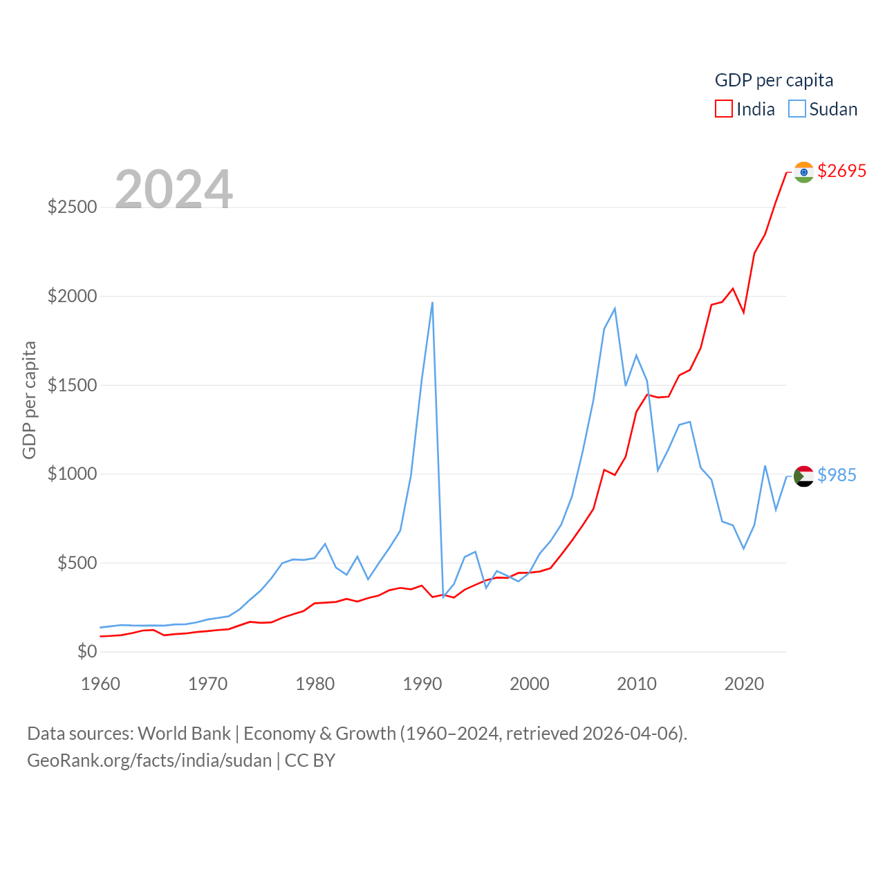 By GDP, India ranks 5/197 ($3.91T) and Sudan ranks 94/197 ($49.7B). By GDP per capita, India ranks 143/197 ($2,695), while Sudan ranks 179/197 ($985).