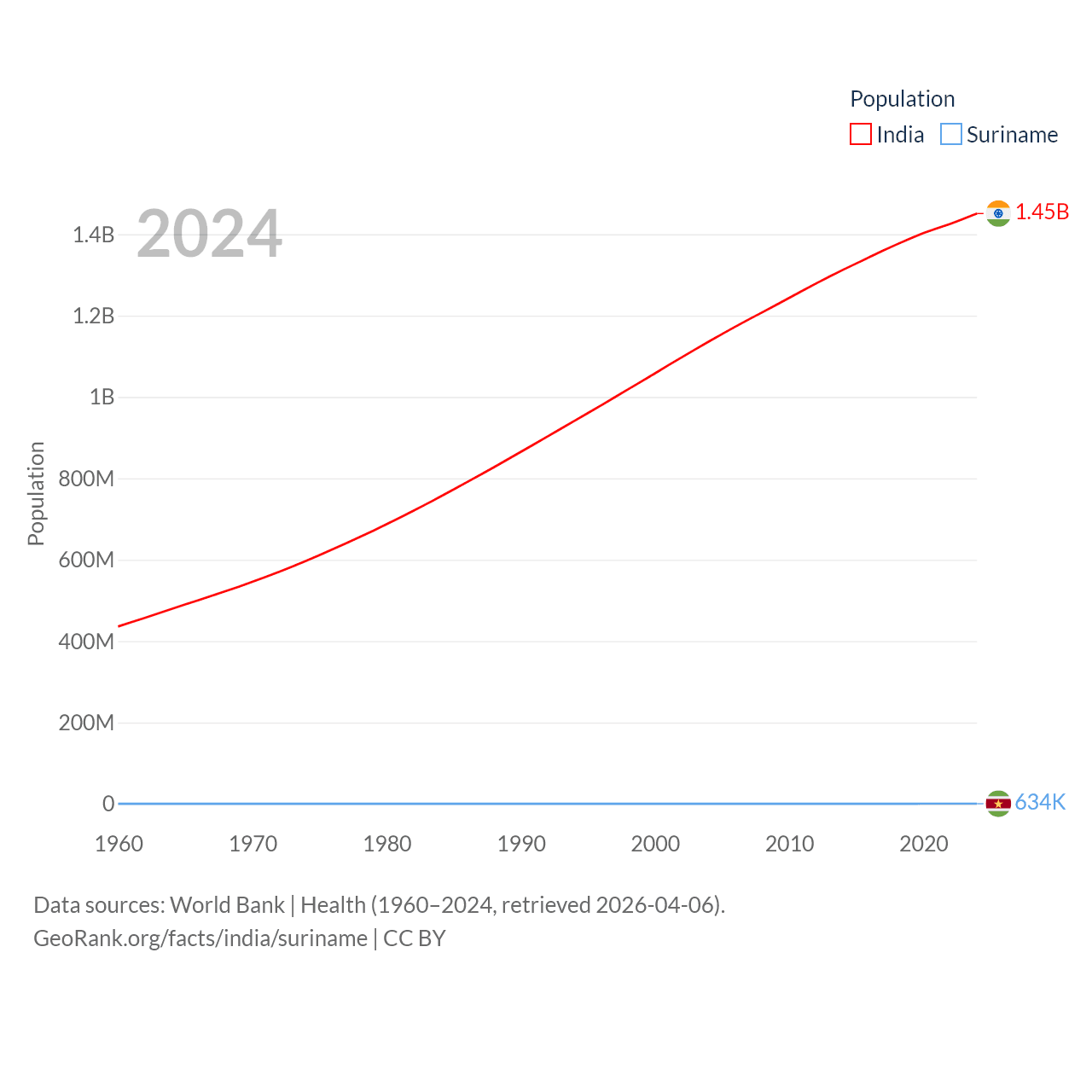 India has a population of 1.45B (ranked 1/197), compared with 634K in Suriname (ranked 165/197). India's land area is 1,147,955 sq mi versus 61,972 sq mi for Suriname (ranked 7th vs. 90th).