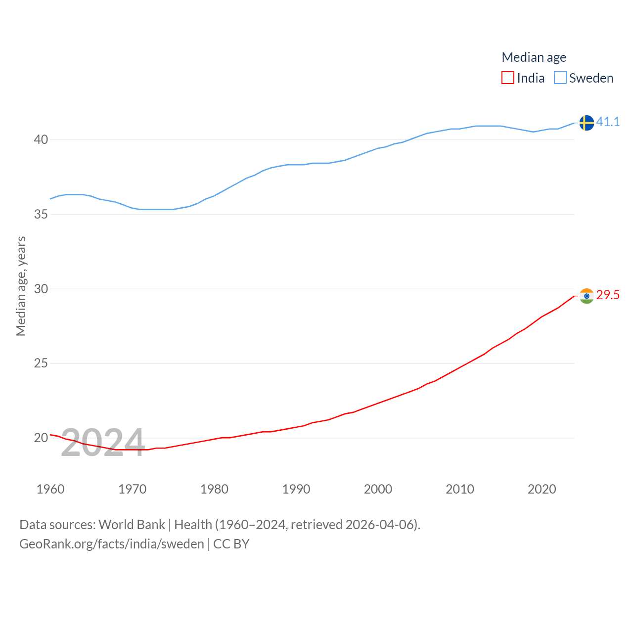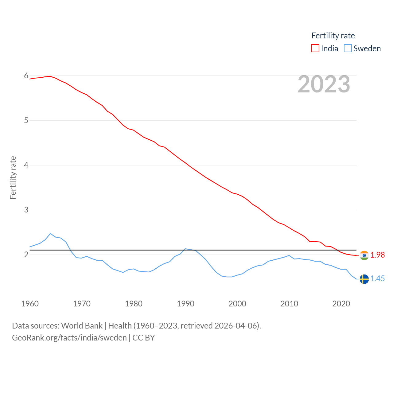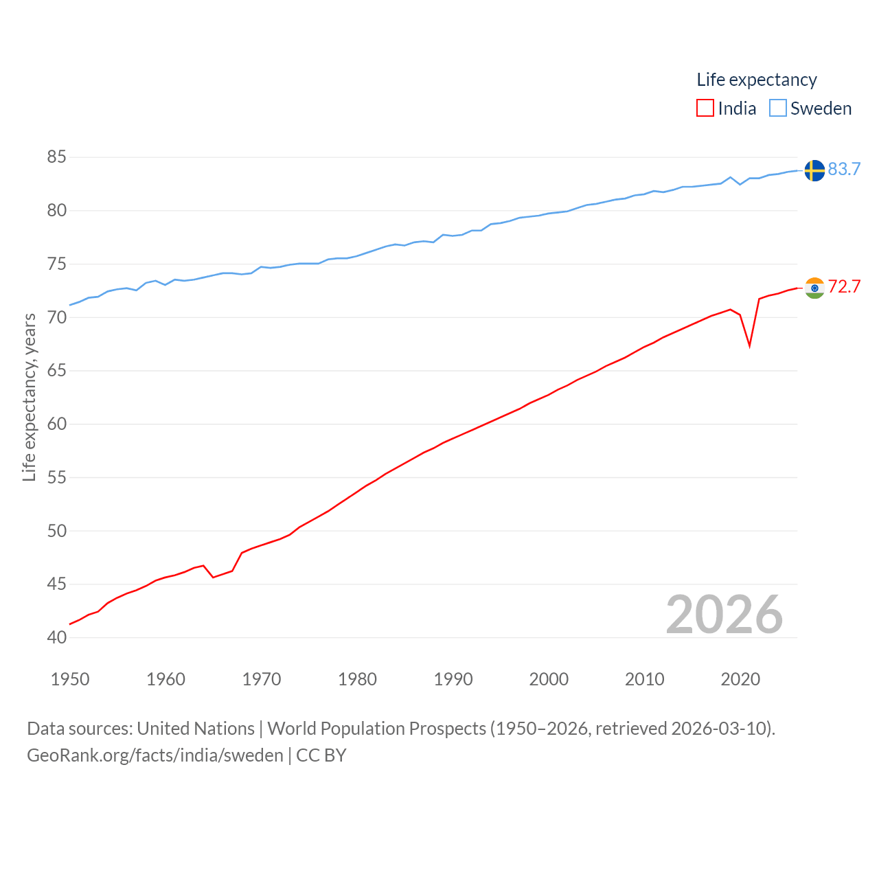 India has a population of 1.45B (ranked 1/197), compared with 10.6M in Sweden (ranked 93/197). India's land area is 1,147,955 sq mi versus 157,248 sq mi for Sweden (ranked 7th vs. 58th).