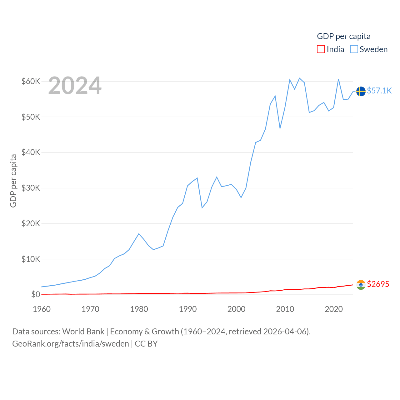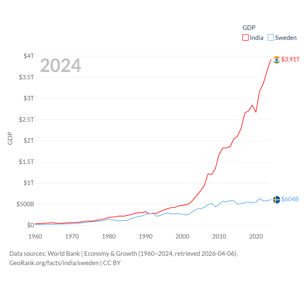 By GDP, India ranks 5/197 ($3.91T) and Sweden ranks 26/197 ($604B). By GDP per capita, India ranks 143/197 ($2,695), while Sweden ranks 17/197 ($57,117).