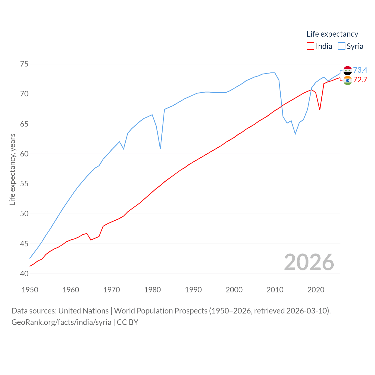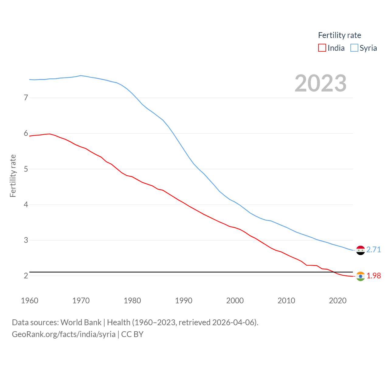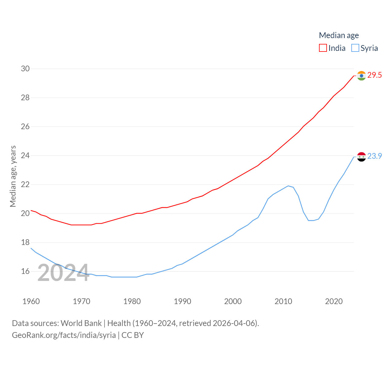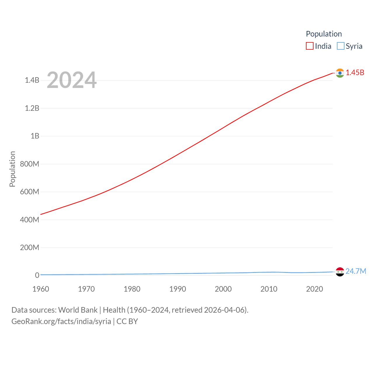 India has a population of 1.45B (ranked 1/197), compared with 24.7M in Syria (ranked 57/197). India's land area is 1,147,955 sq mi versus 70,900 sq mi for Syria (ranked 7th vs. 87th).