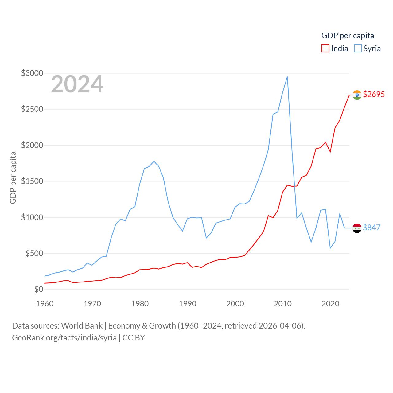 By GDP, India ranks 5/197 ($3.91T) and Syria ranks 129/197 ($20B). By GDP per capita, India ranks 143/197 ($2,695), while Syria ranks 185/197 ($847).