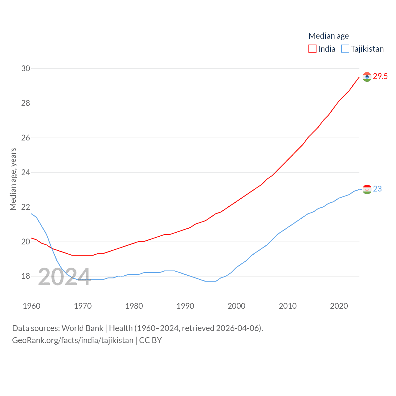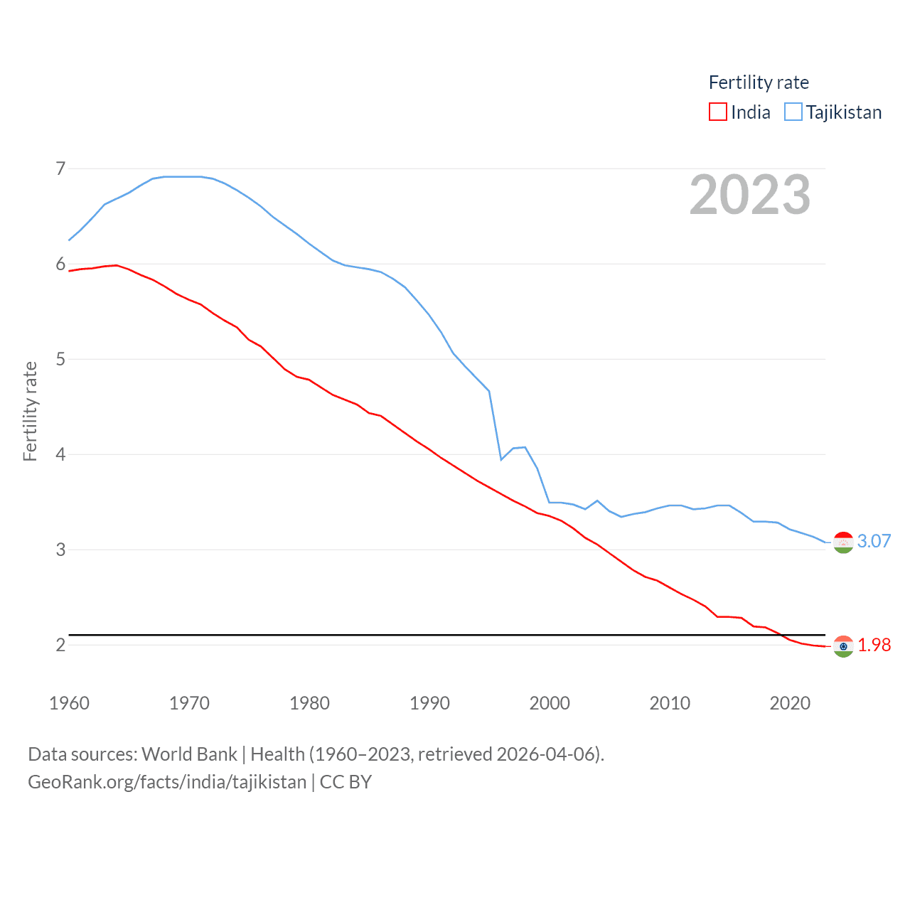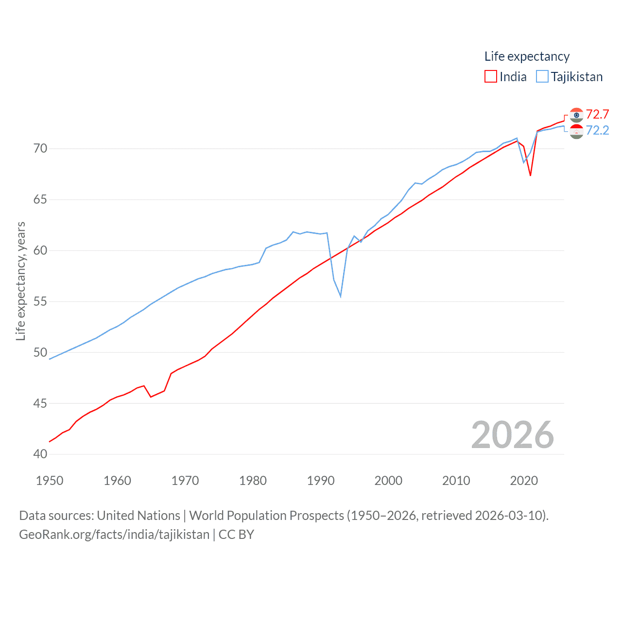 India has a population of 1.45B (ranked 1/197), compared with 10.6M in Tajikistan (ranked 91/197). India's land area is 1,147,955 sq mi versus 53,587 sq mi for Tajikistan (ranked 7th vs. 93rd).