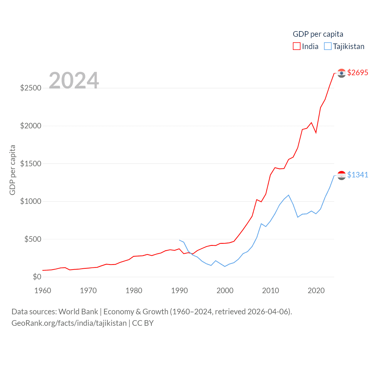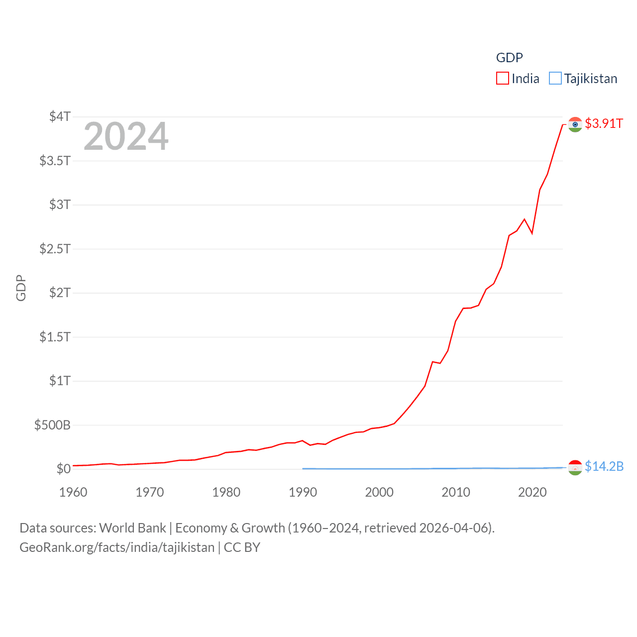 By GDP, India ranks 5/197 ($3.91T) and Tajikistan ranks 145/197 ($14.2B). By GDP per capita, India ranks 143/197 ($2,695), while Tajikistan ranks 166/197 ($1,341).
