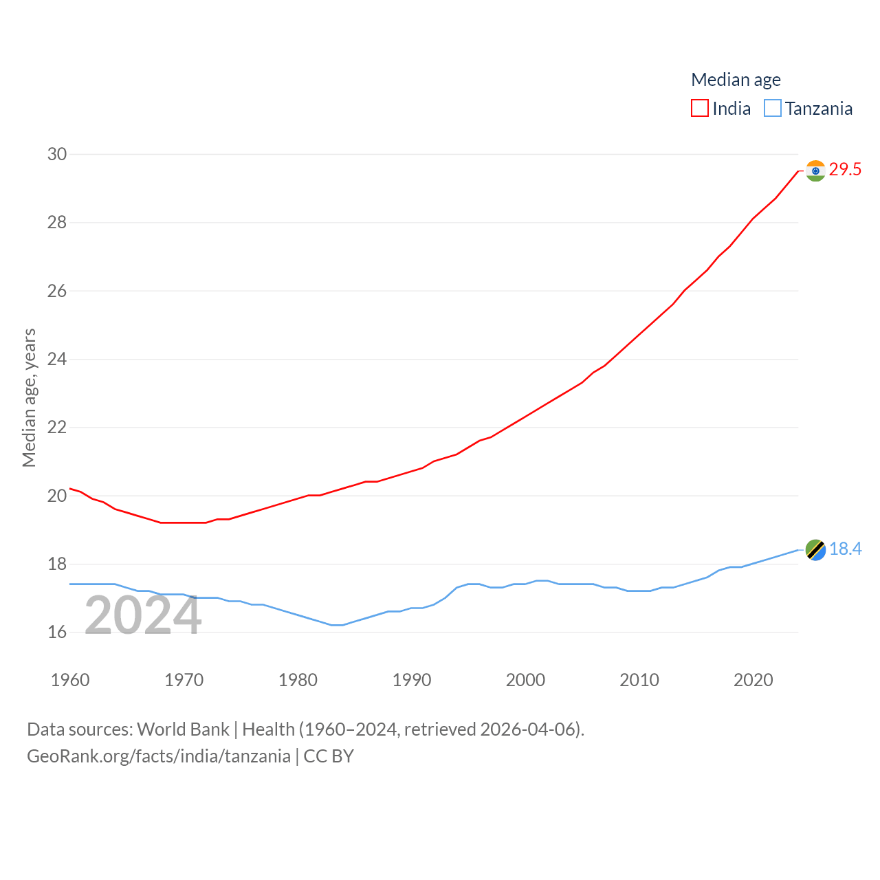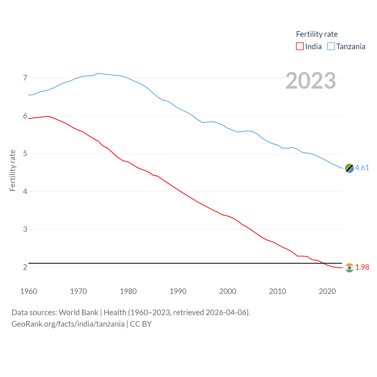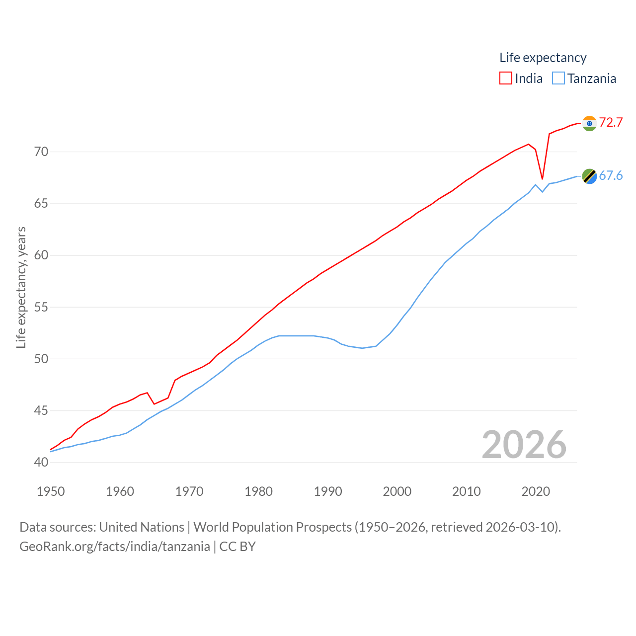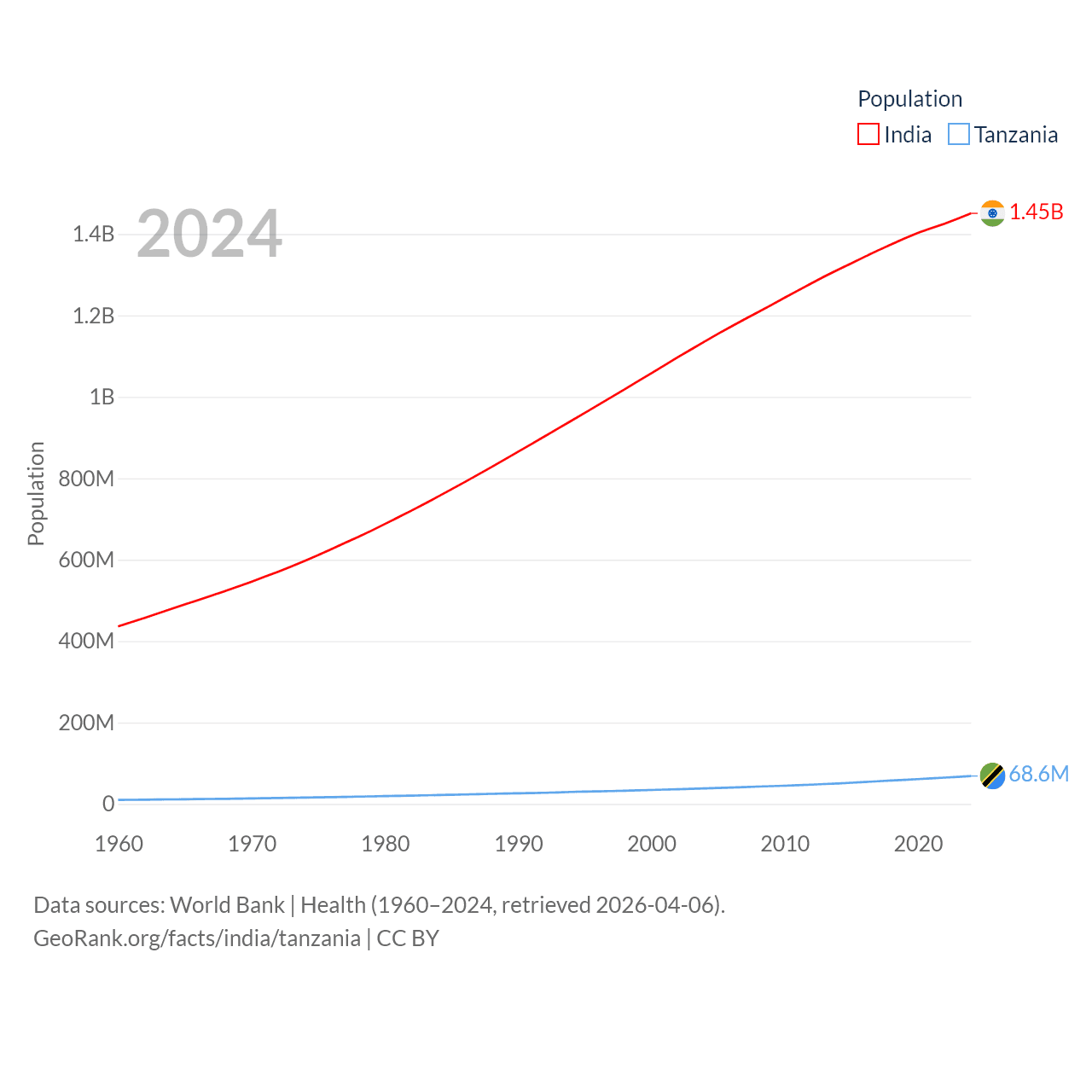 India has a population of 1.45B (ranked 1/197), compared with 68.6M in Tanzania (ranked 22/197). India's land area is 1,147,955 sq mi versus 342,009 sq mi for Tanzania (ranked 7th vs. 31st).