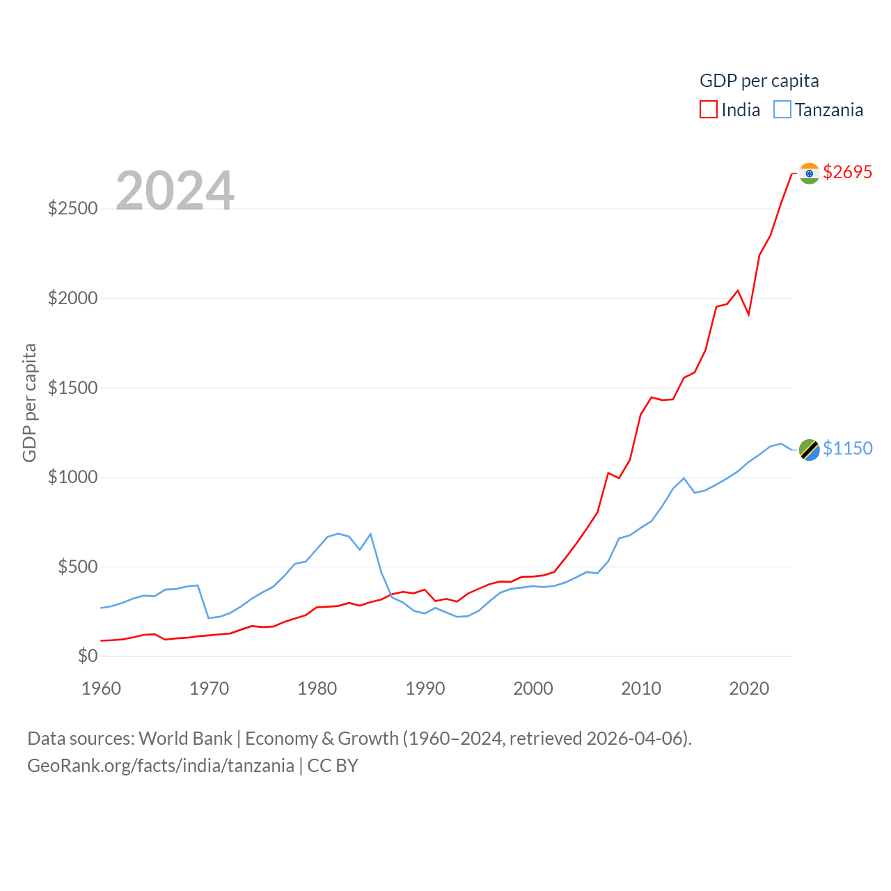 By GDP, India ranks 5/197 ($3.91T) and Tanzania ranks 82/197 ($78.8B). By GDP per capita, India ranks 143/197 ($2,695), while Tanzania ranks 170/197 ($1,150).