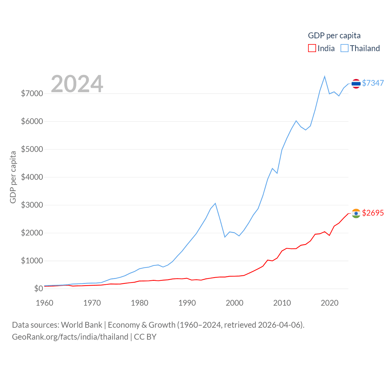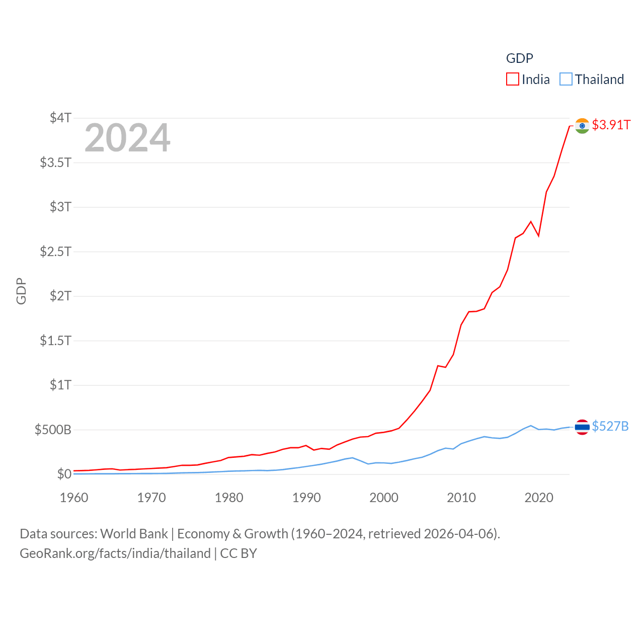By GDP, India ranks 5/197 ($3.91T) and Thailand ranks 31/197 ($527B). By GDP per capita, India ranks 143/197 ($2,695), while Thailand ranks 100/197 ($7,347).