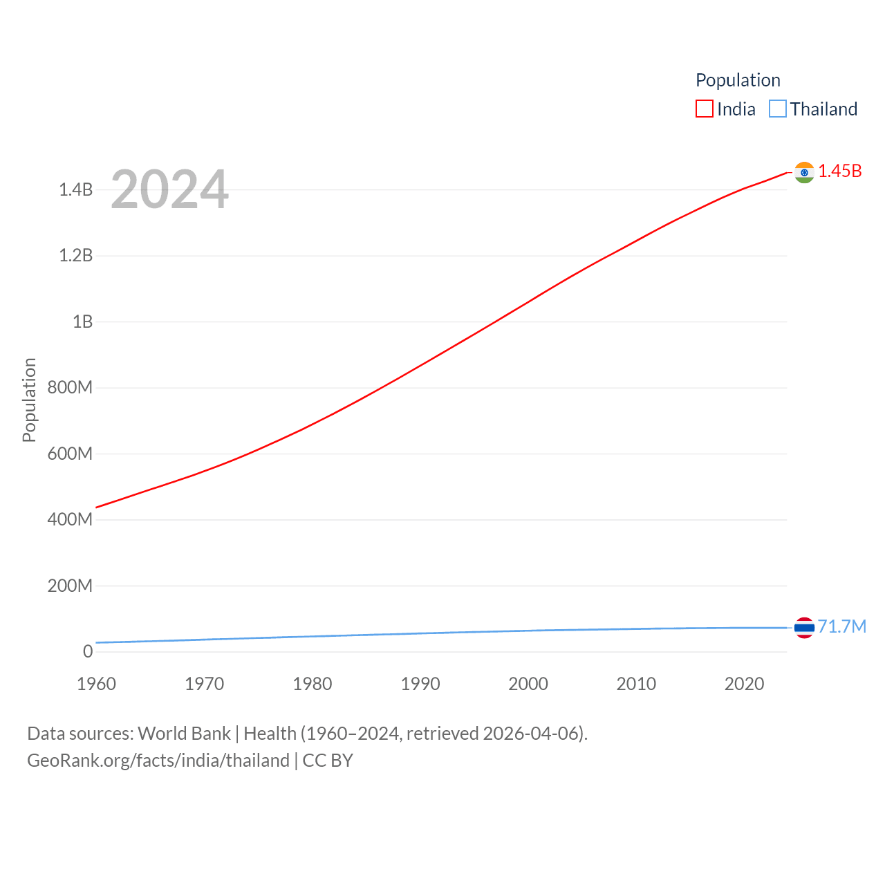 India has a population of 1.45B (ranked 1/197), compared with 71.7M in Thailand (ranked 20/197). India's land area is 1,147,955 sq mi versus 197,256 sq mi for Thailand (ranked 7th vs. 50th).