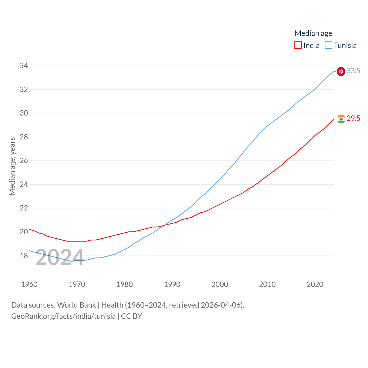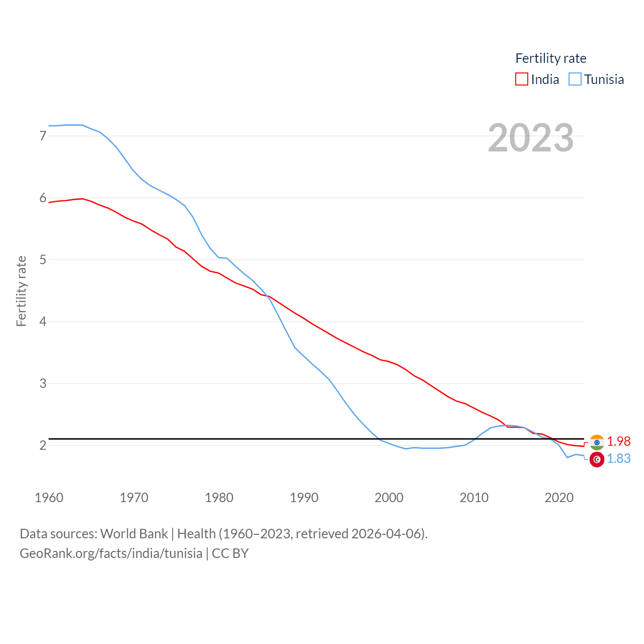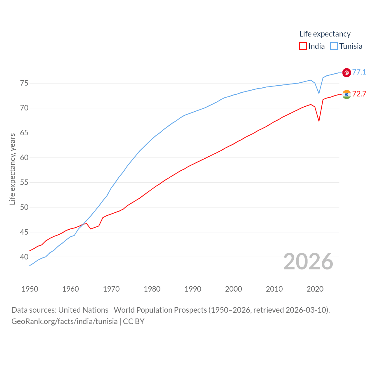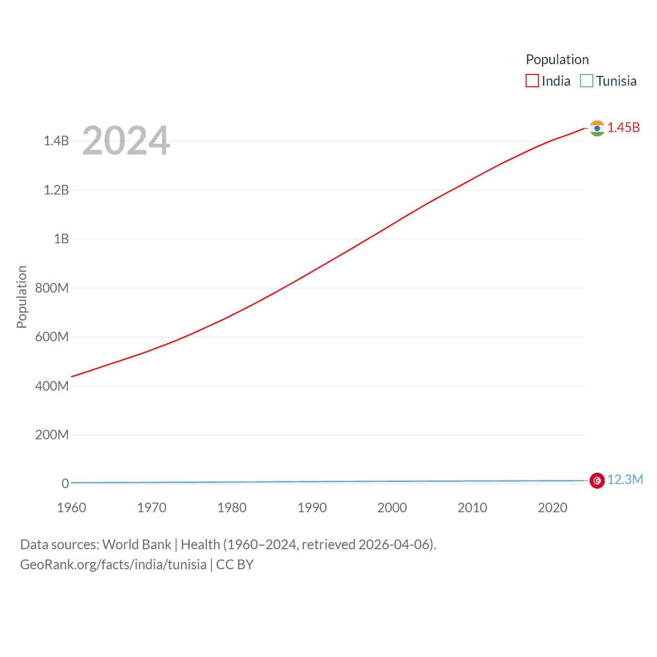 India has a population of 1.45B (ranked 1/197), compared with 12.3M in Tunisia (ranked 80/197). India's land area is 1,147,955 sq mi versus 59,985 sq mi for Tunisia (ranked 7th vs. 91st).