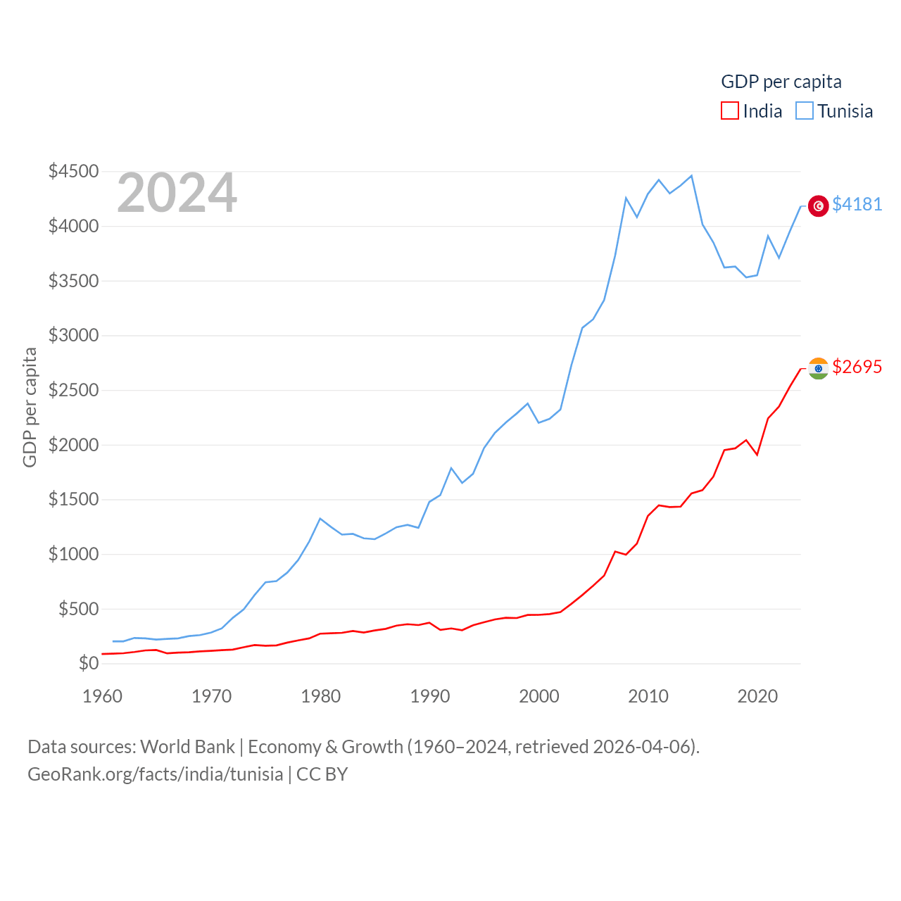 By GDP, India ranks 5/197 ($3.91T) and Tunisia ranks 93/197 ($51.3B). By GDP per capita, India ranks 143/197 ($2,695), while Tunisia ranks 129/197 ($4,181).