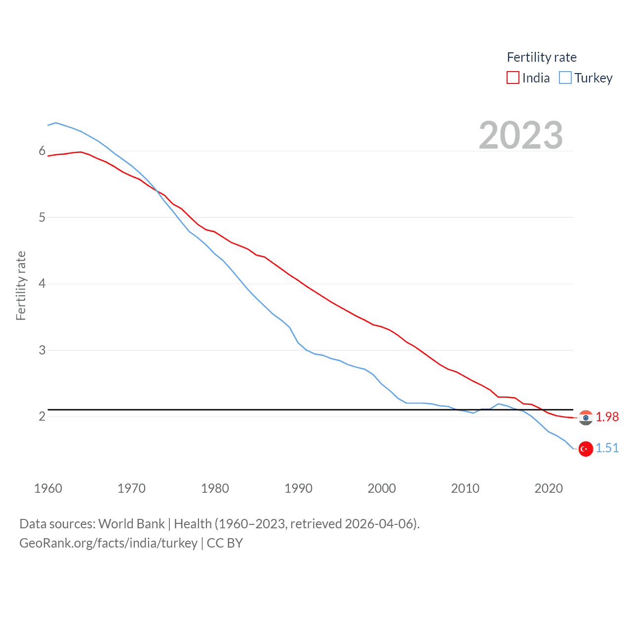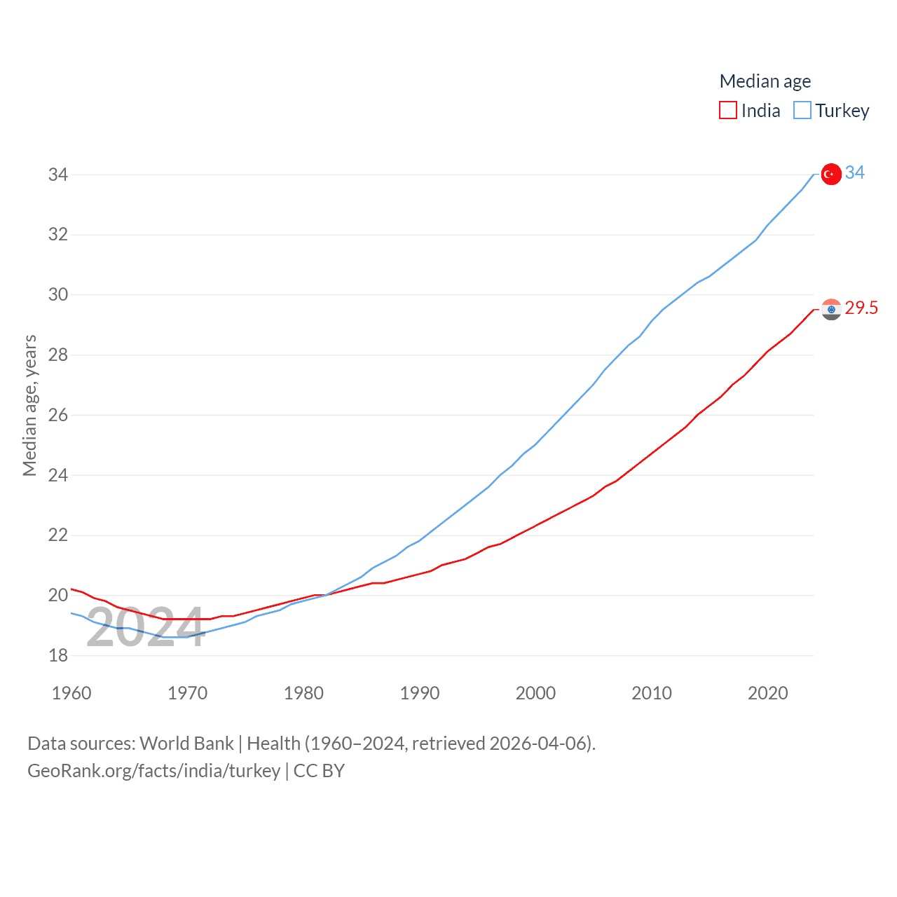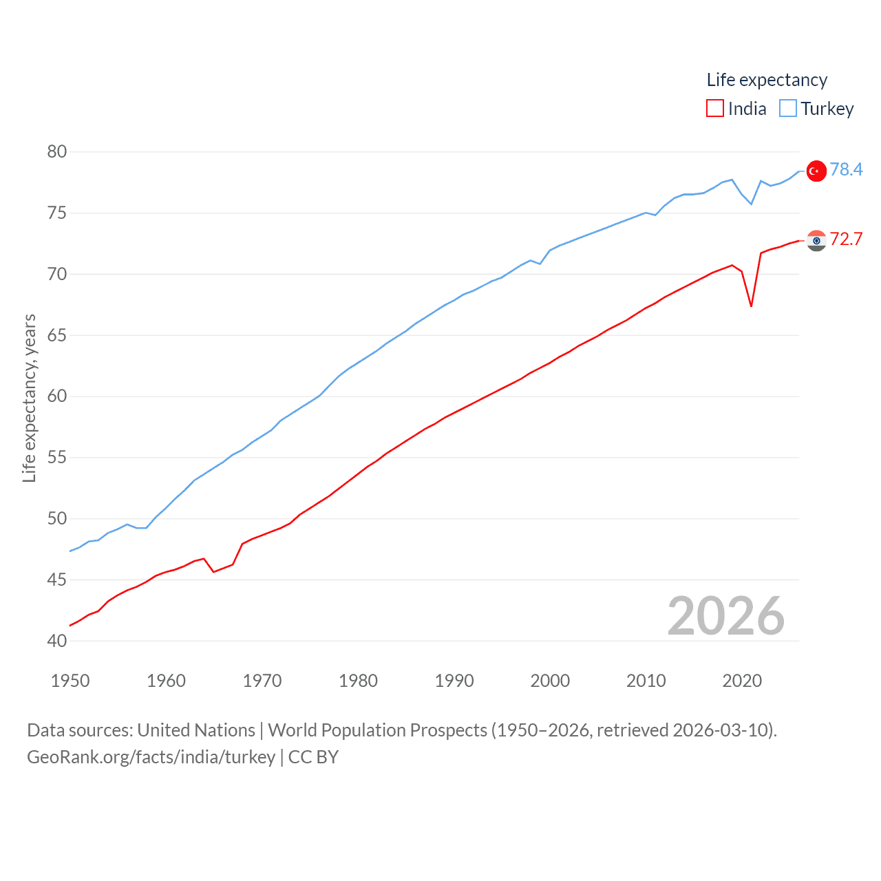 India has a population of 1.45B (ranked 1/197), compared with 85.5M in Turkey (ranked 18/197). India's land area is 1,147,955 sq mi versus 297,156 sq mi for Turkey (ranked 7th vs. 36th).