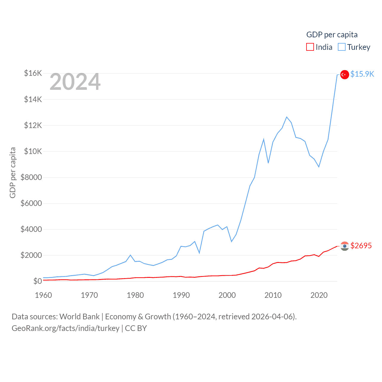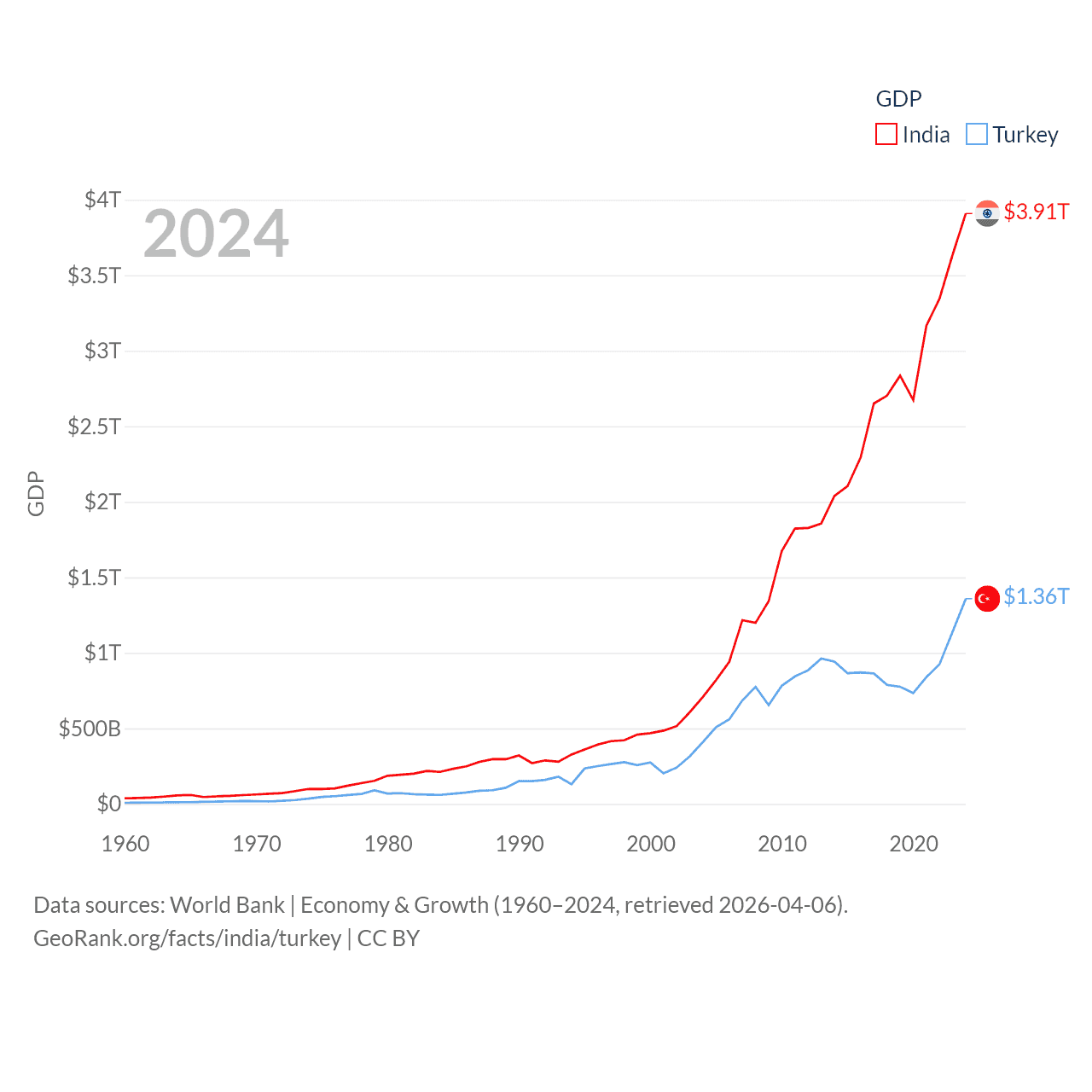 By GDP, India ranks 5/197 ($3.91T) and Turkey ranks 17/197 ($1.36T). By GDP per capita, India ranks 143/197 ($2,695), while Turkey ranks 66/197 ($15,893).