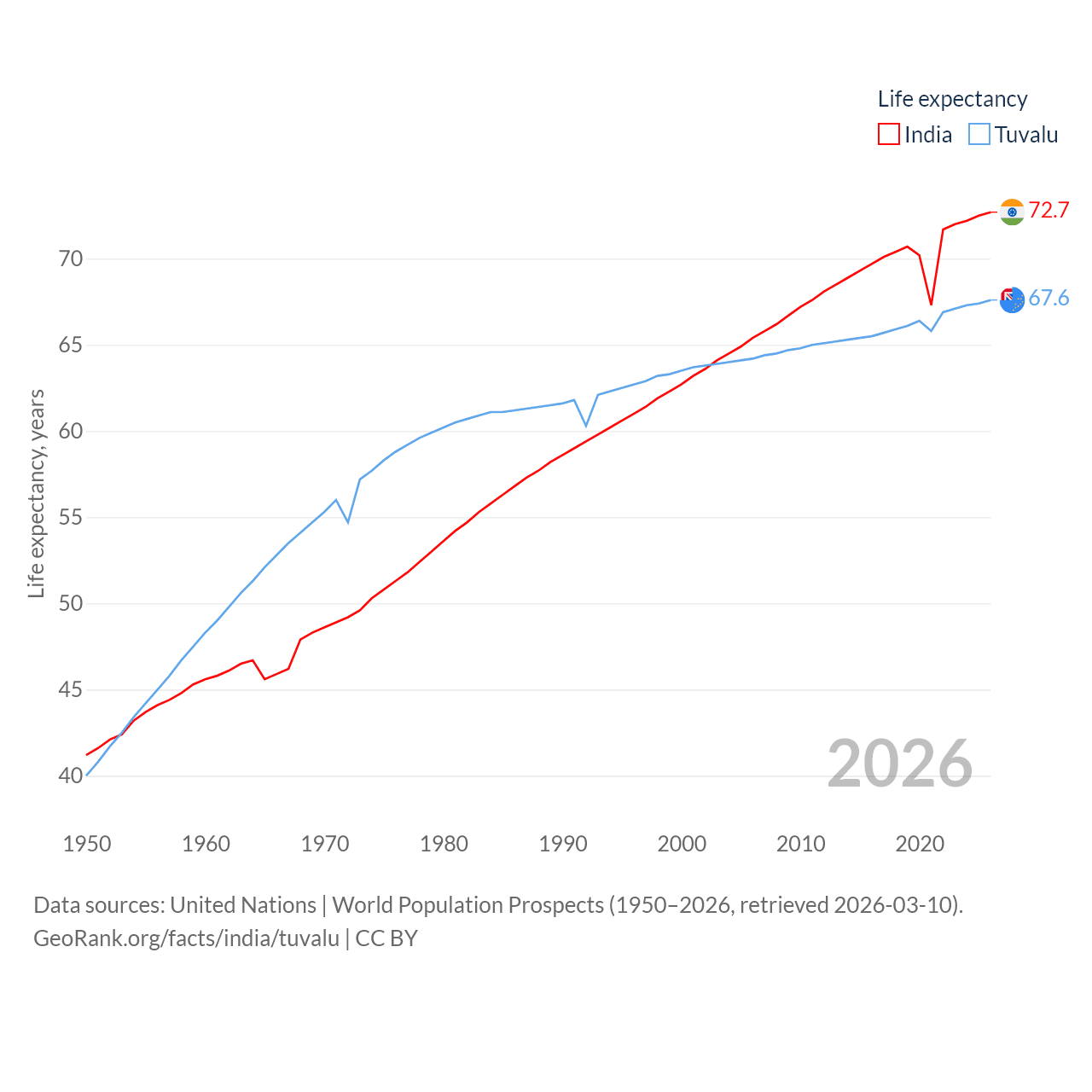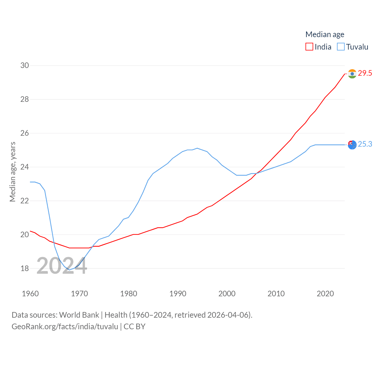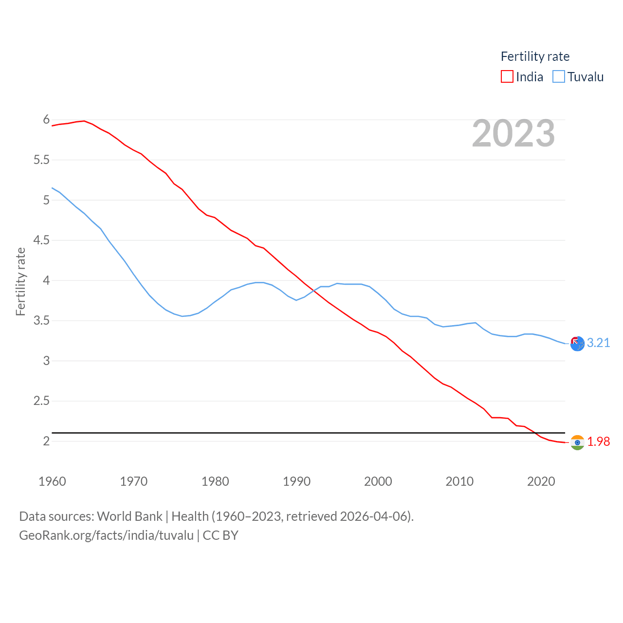 India has a population of 1.45B (ranked 1/197), compared with 9.65K in Tuvalu (ranked 196/197). India's land area is 1,147,955 sq mi versus 11.6 sq mi for Tuvalu (ranked 7th vs. 194th).