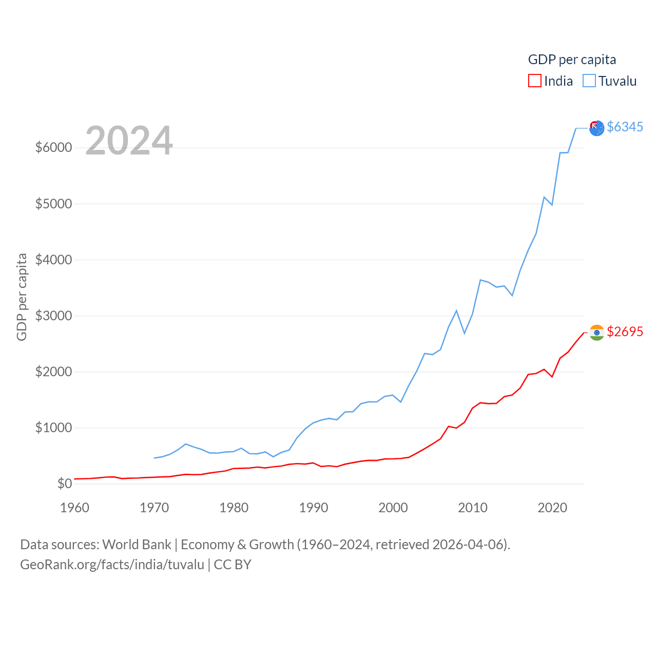 By GDP, India ranks 5/197 ($3.91T) and Tuvalu ranks 196/197 ($62.3M). By GDP per capita, India ranks 143/197 ($2,695), while Tuvalu ranks 110/197 ($6,345).