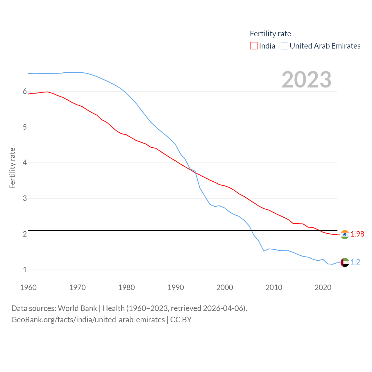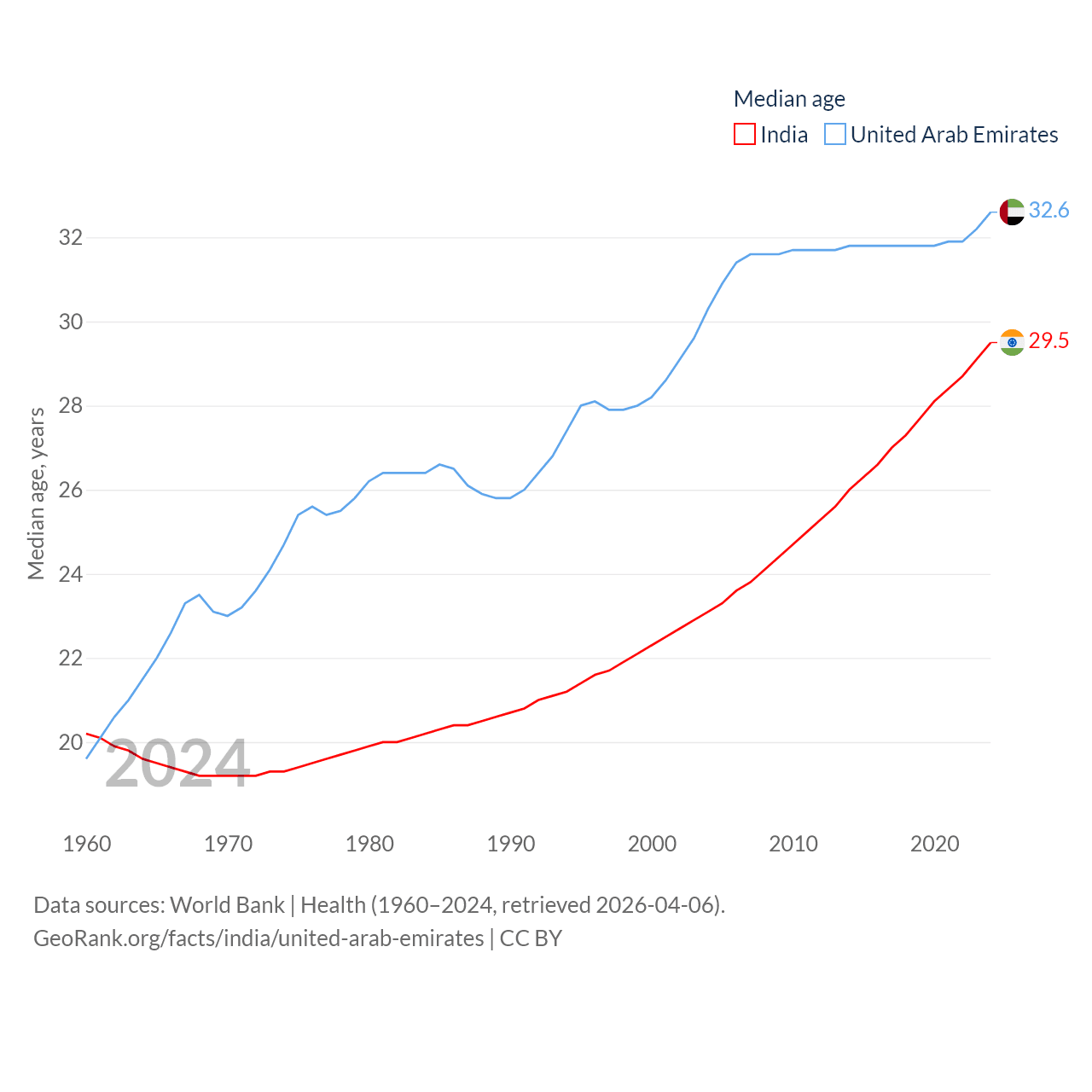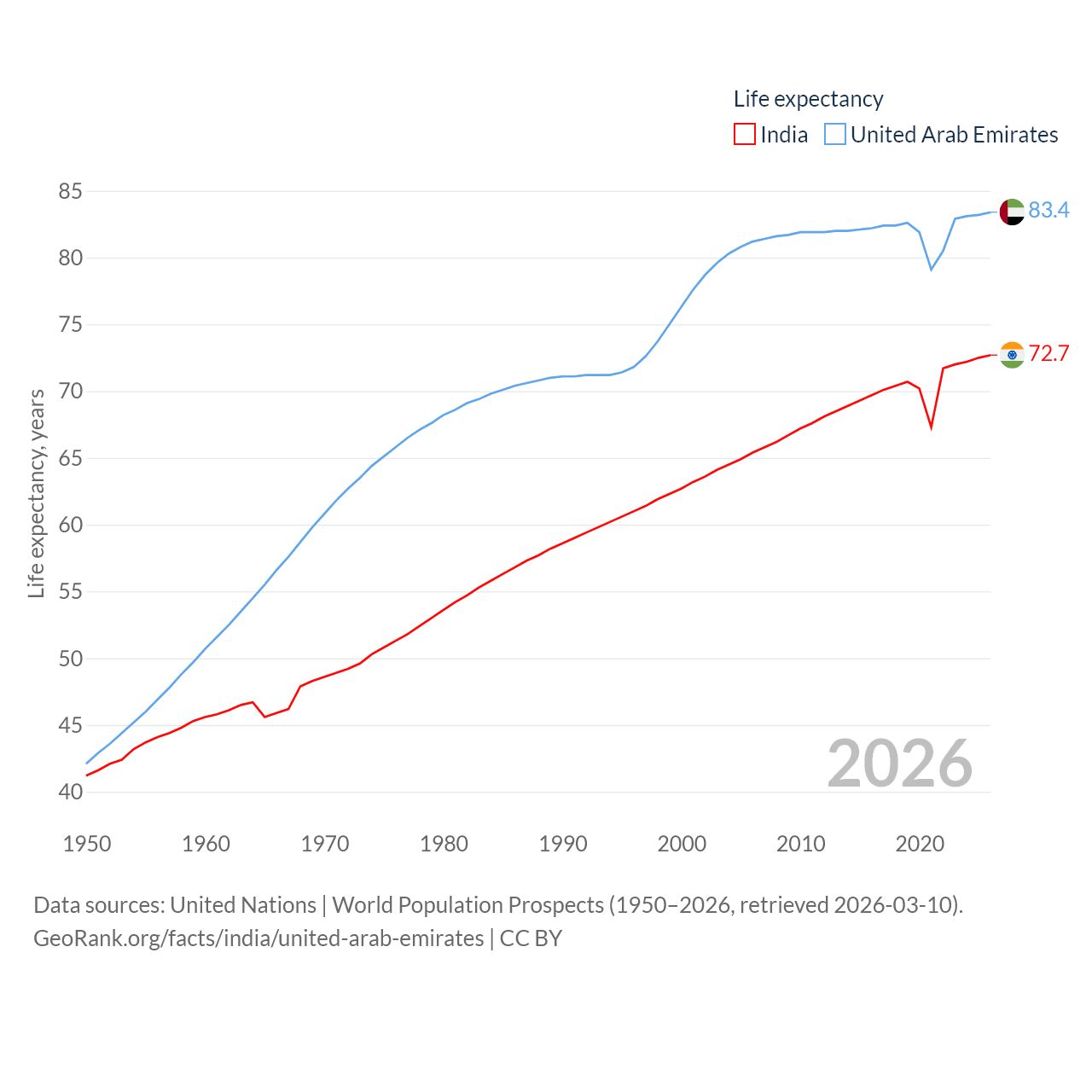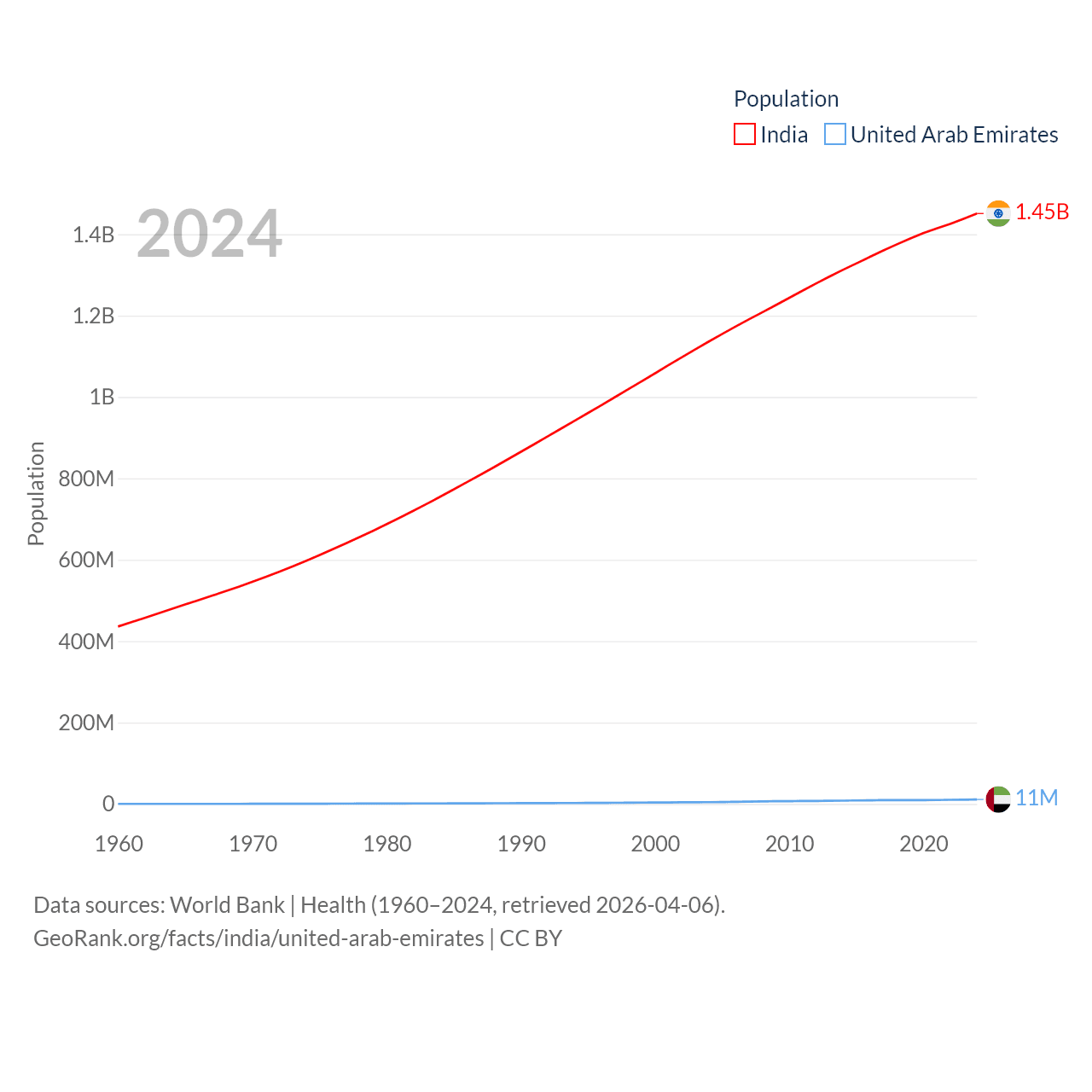 India has a population of 1.45B (ranked 1/197), compared with 11M in The United Arab Emirates (ranked 86/197). India's land area is 1,147,955 sq mi versus 27,421 sq mi for The United Arab Emirates (ranked 7th vs. 117th).