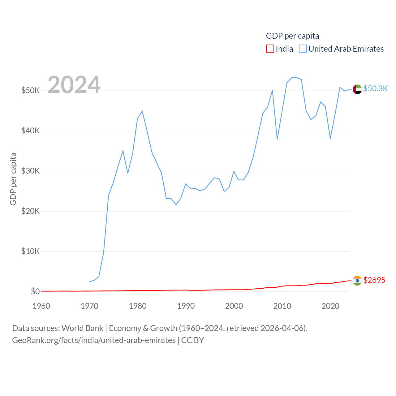 By GDP, India ranks 5/197 ($3.91T) and The United Arab Emirates ranks 27/197 ($552B). By GDP per capita, India ranks 143/197 ($2,695), while The United Arab Emirates ranks 24/197 ($50,274).