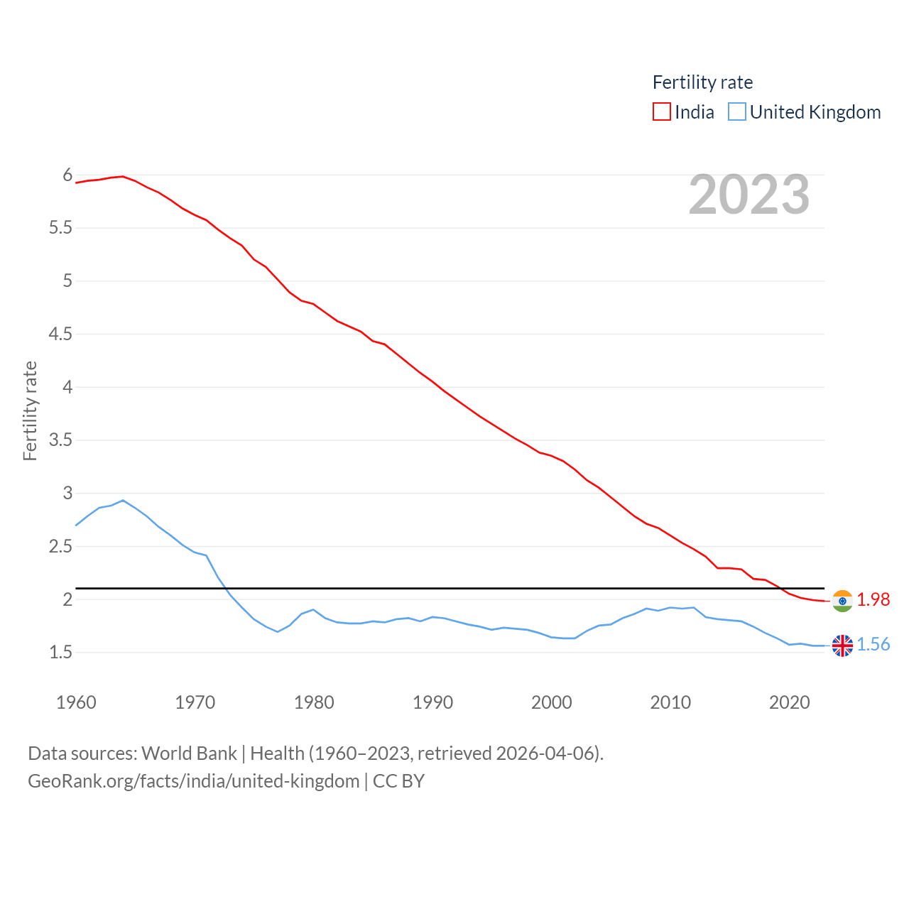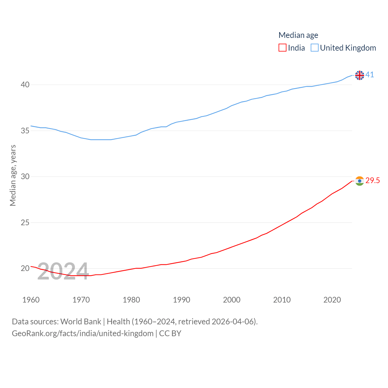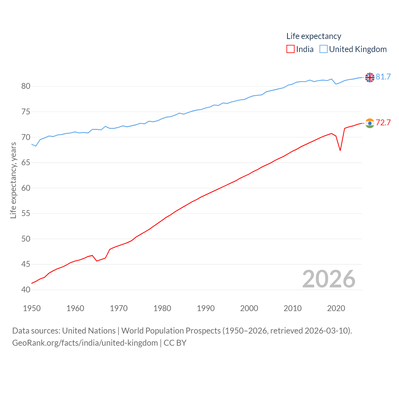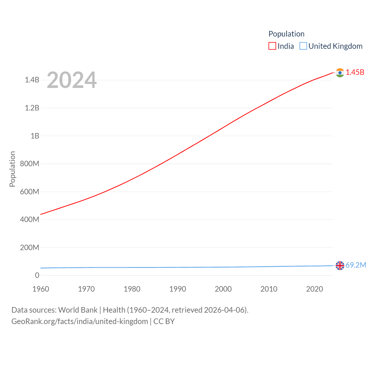 India has a population of 1.45B (ranked 1/197), compared with 69.2M in The United Kingdom (ranked 21/197). India's land area is 1,147,955 sq mi versus 93,410 sq mi for The United Kingdom (ranked 7th vs. 78th).