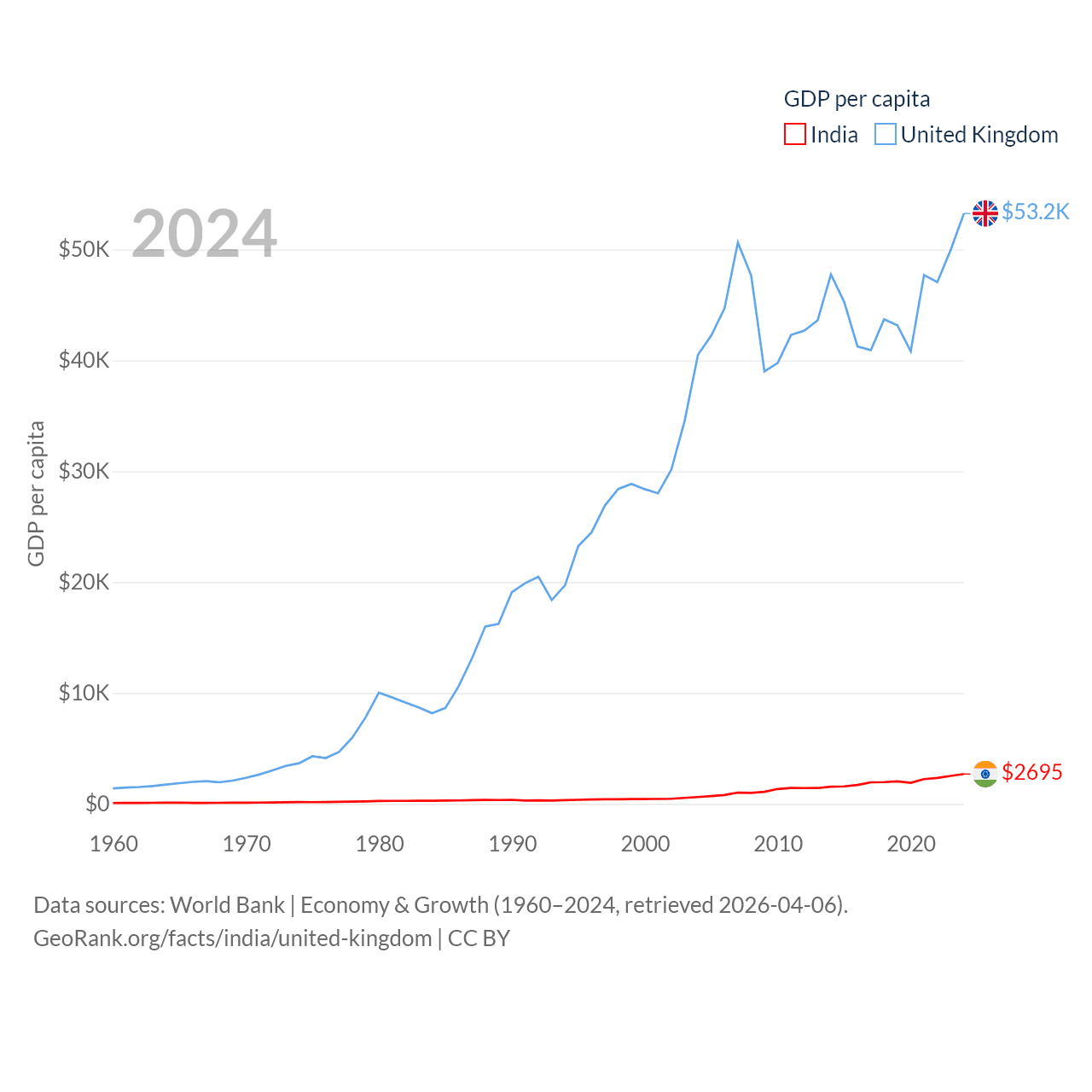 By GDP, India ranks 5/197 ($3.91T) and The United Kingdom ranks 6/197 ($3.69T). By GDP per capita, India ranks 143/197 ($2,695), while The United Kingdom ranks 22/197 ($53,246).