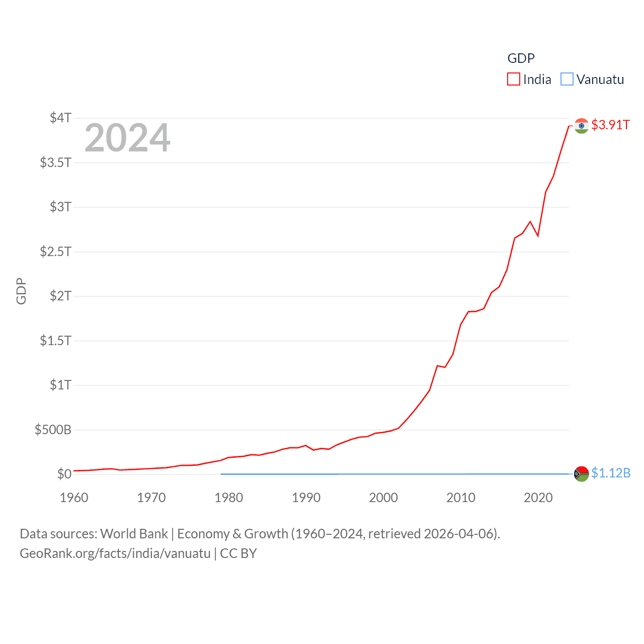 By GDP, India ranks 5/197 ($3.91T) and Vanuatu ranks 188/197 ($1.12B). By GDP per capita, India ranks 143/197 ($2,695), while Vanuatu ranks 137/197 ($3,411).