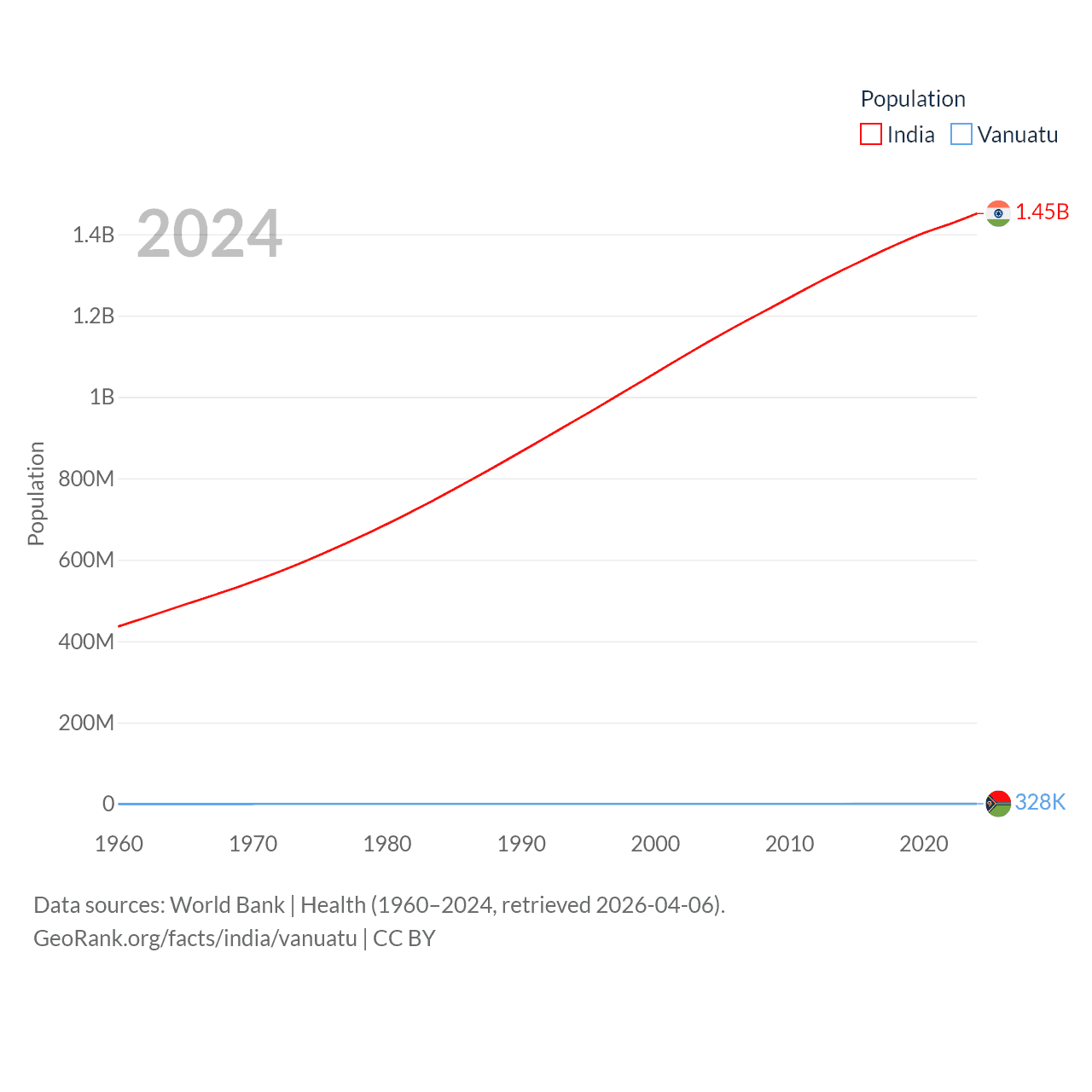 India has a population of 1.45B (ranked 1/197), compared with 328K in Vanuatu (ranked 174/197). India's land area is 1,147,955 sq mi versus 4,707 sq mi for Vanuatu (ranked 7th vs. 157th).