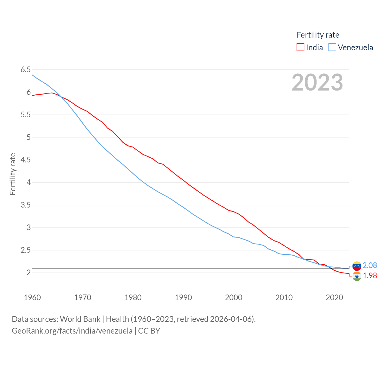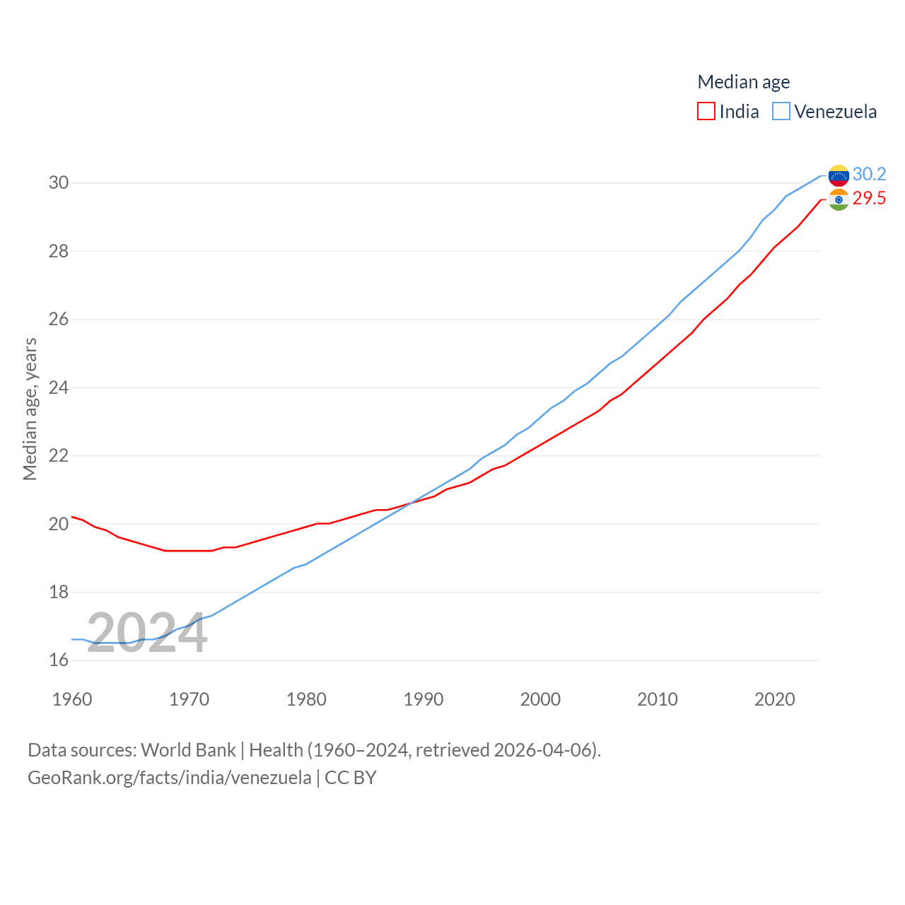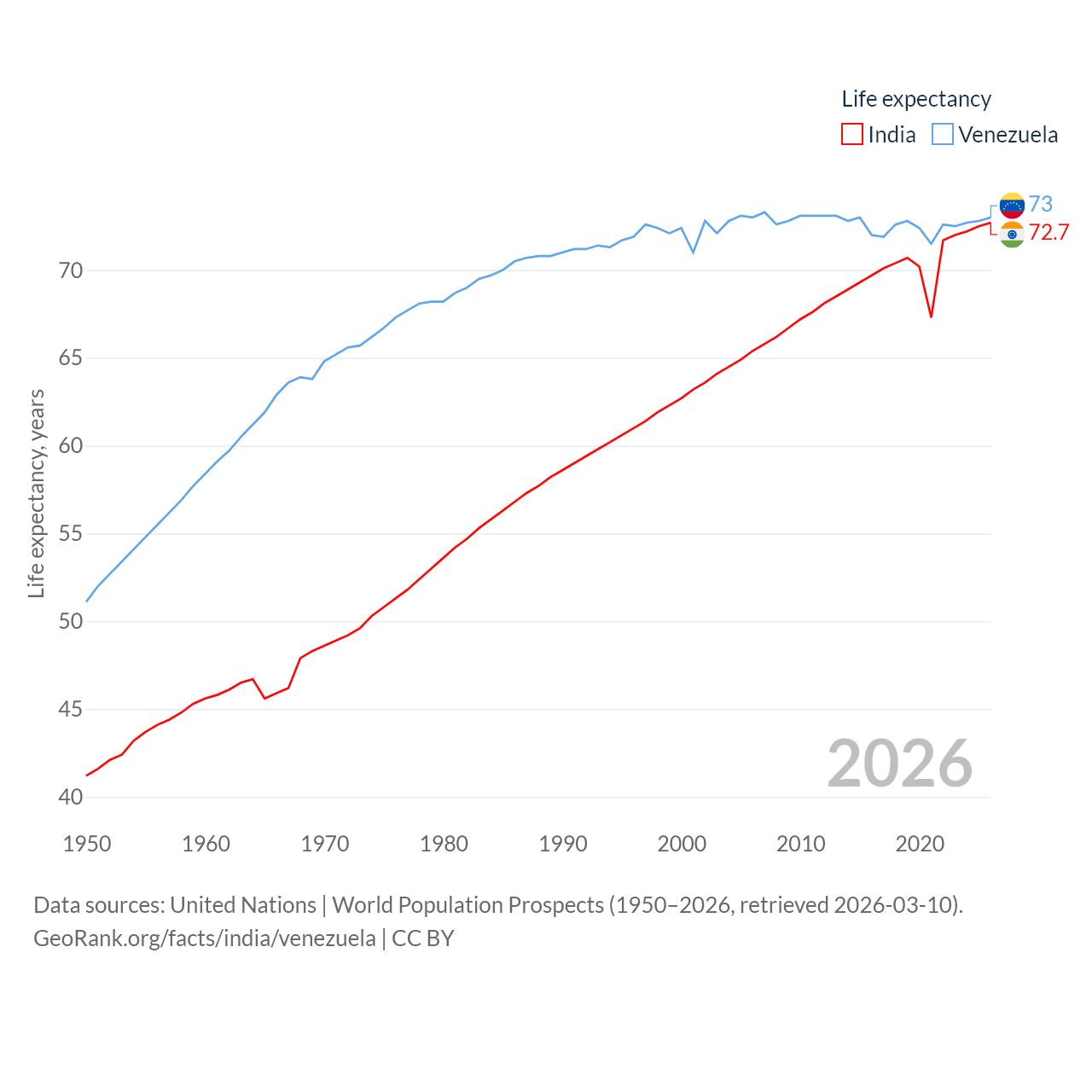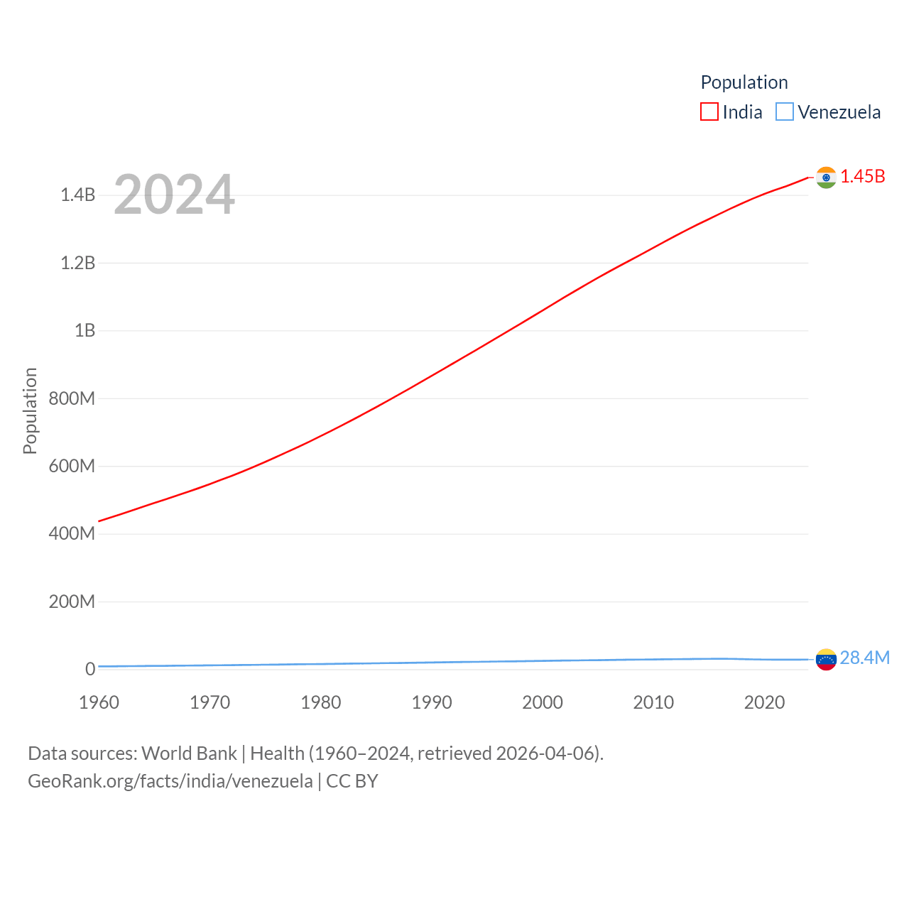 India has a population of 1.45B (ranked 1/197), compared with 28.4M in Venezuela (ranked 53/197). India's land area is 1,147,955 sq mi versus 340,561 sq mi for Venezuela (ranked 7th vs. 32nd).