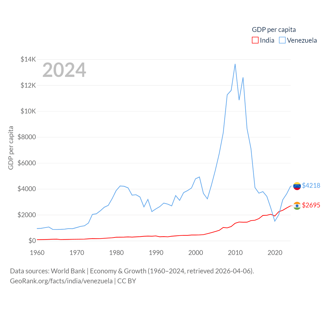 By GDP, India ranks 5/197 ($3.91T) and Venezuela ranks 65/197 ($120B). By GDP per capita, India ranks 143/197 ($2,695), while Venezuela ranks 128/197 ($4,218).