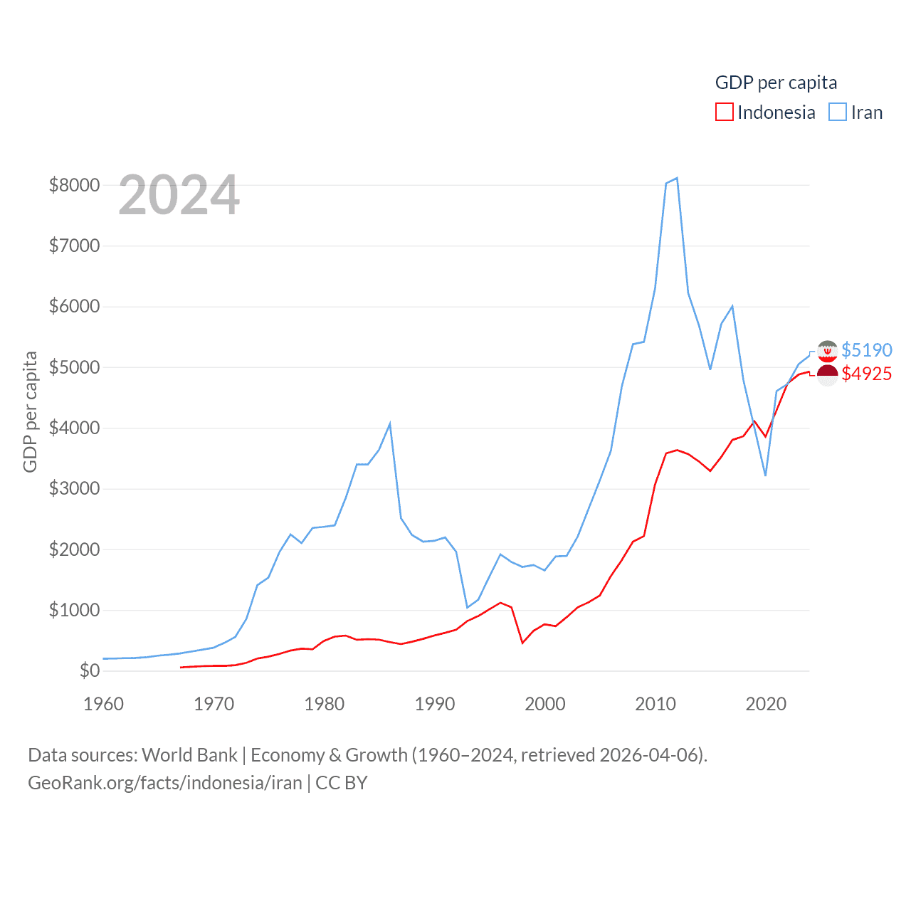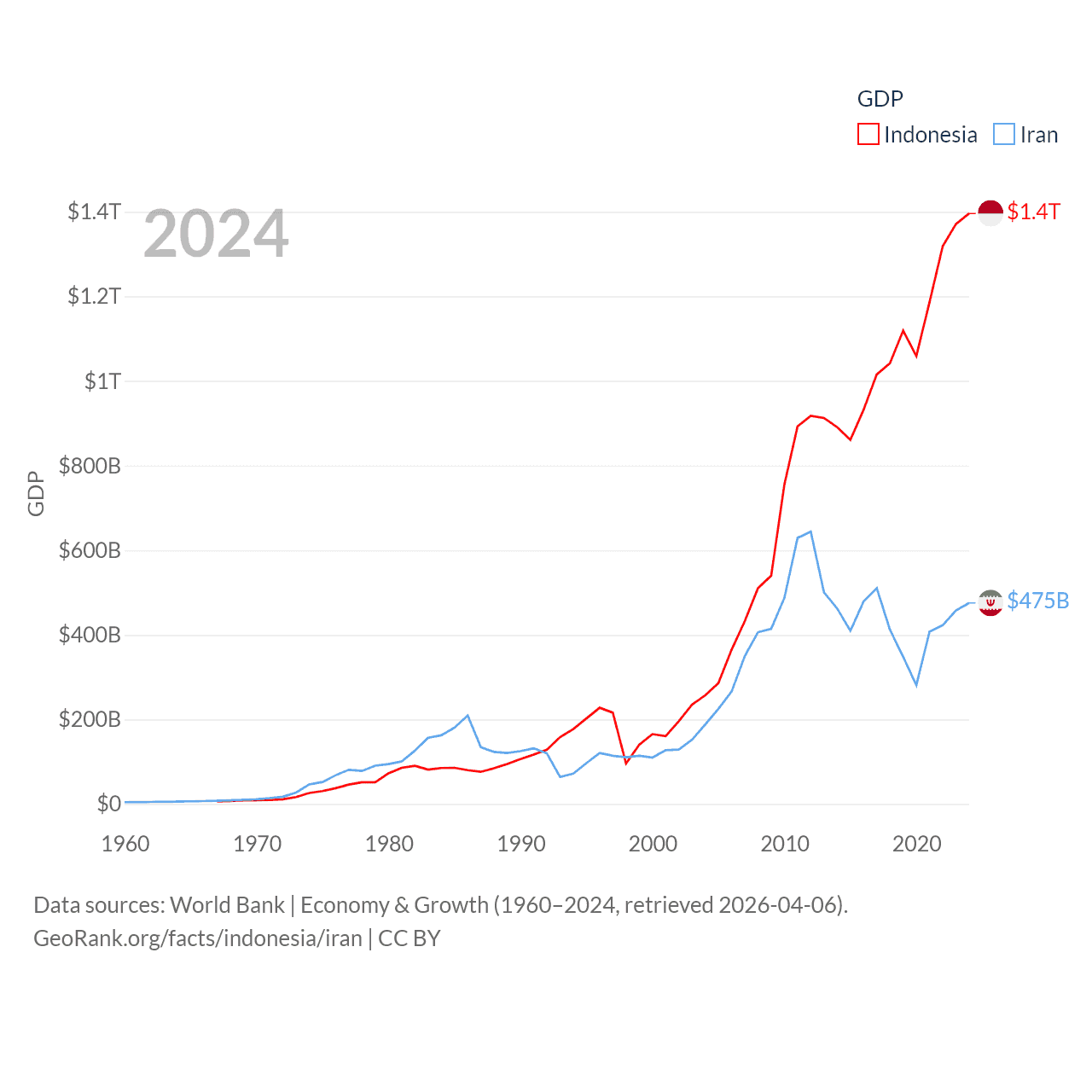 By GDP, Indonesia ranks 16/197 ($1.4T) and Iran ranks 34/197 ($475B). By GDP per capita, Indonesia ranks 121/197 ($4,925), while Iran ranks 119/197 ($5,190).