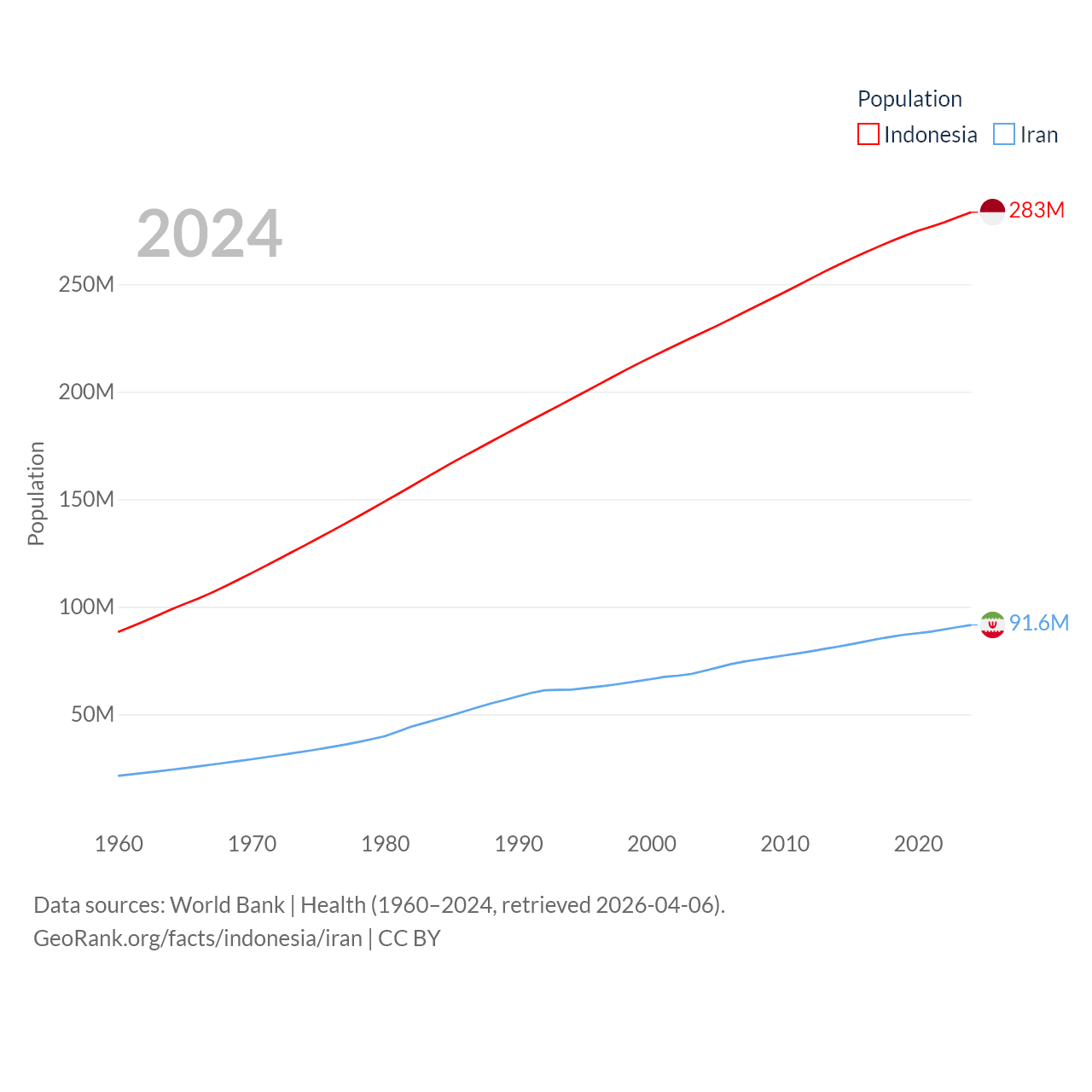 Indonesia has a population of 283M (ranked 4/197), compared with 91.6M in Iran (ranked 17/197). Indonesia's land area is 730,720 sq mi versus 626,451 sq mi for Iran (ranked 14th vs. 17th).