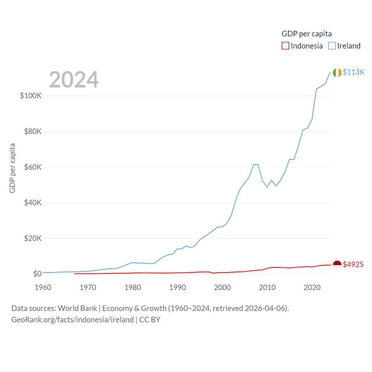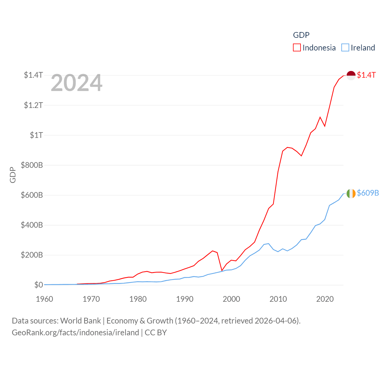 By GDP, Indonesia ranks 16/197 ($1.4T) and Ireland ranks 25/197 ($609B). By GDP per capita, Indonesia ranks 121/197 ($4,925), while Ireland ranks 4/197 ($112,895).