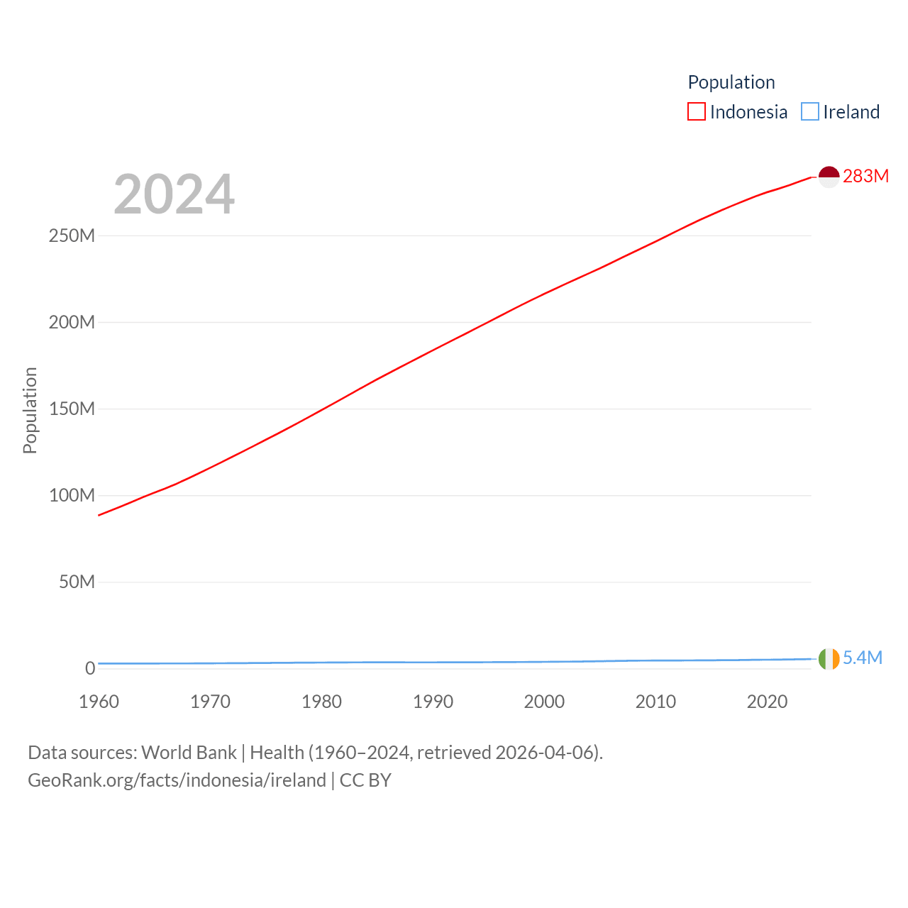 Indonesia has a population of 283M (ranked 4/197), compared with 5.4M in Ireland (ranked 120/197). Indonesia's land area is 730,720 sq mi versus 26,599 sq mi for Ireland (ranked 14th vs. 119th).