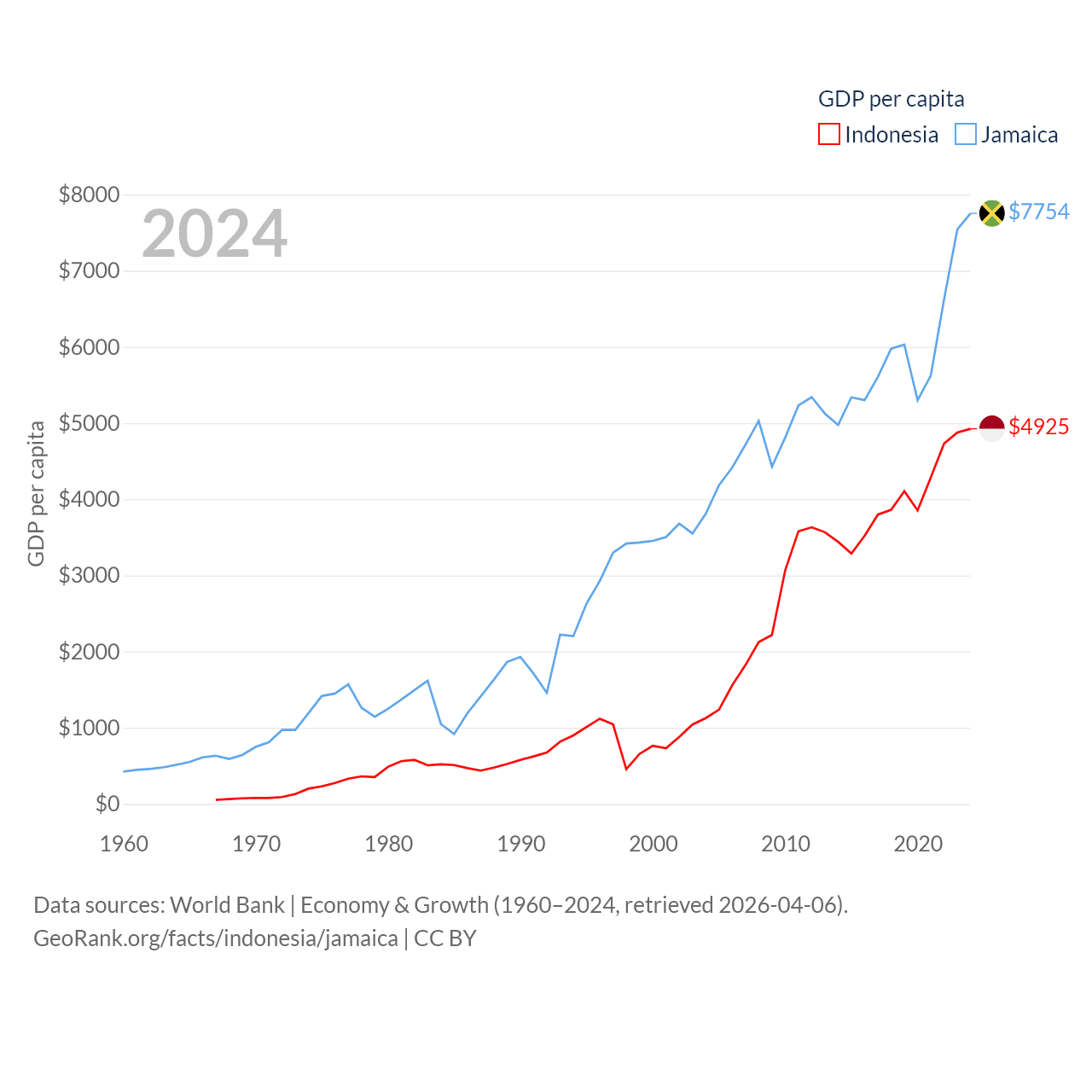 By GDP, Indonesia ranks 16/197 ($1.4T) and Jamaica ranks 124/197 ($22B). By GDP per capita, Indonesia ranks 121/197 ($4,925), while Jamaica ranks 95/197 ($7,754).