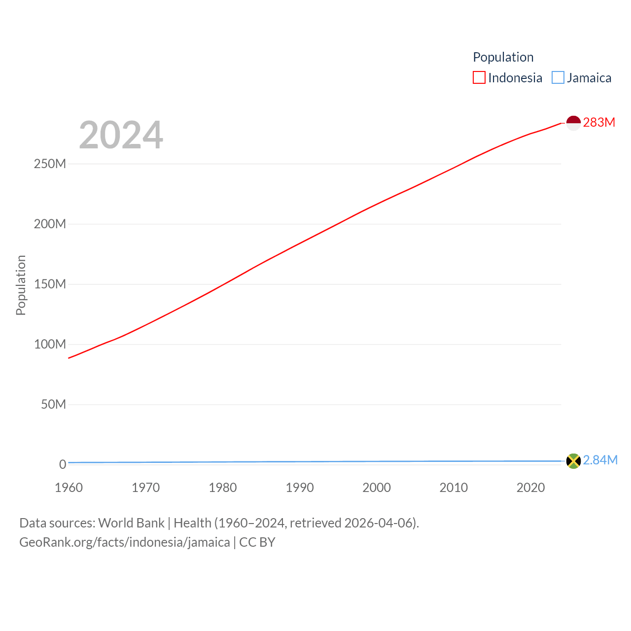 Indonesia has a population of 283M (ranked 4/197), compared with 2.84M in Jamaica (ranked 139/197). Indonesia's land area is 730,720 sq mi versus 4,181 sq mi for Jamaica (ranked 14th vs. 159th).