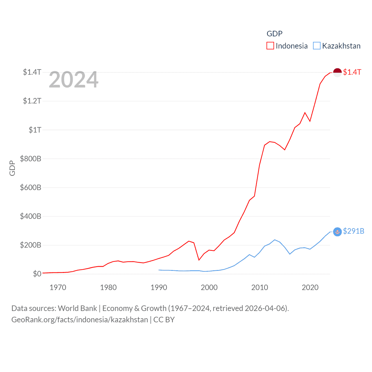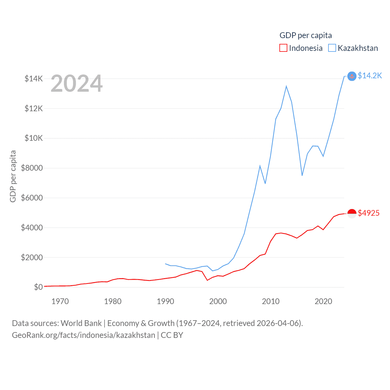 By GDP, Indonesia ranks 16/197 ($1.4T) and Kazakhstan ranks 48/197 ($291B). By GDP per capita, Indonesia ranks 121/197 ($4,925), while Kazakhstan ranks 71/197 ($14,155).